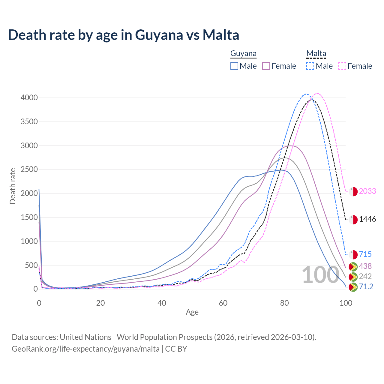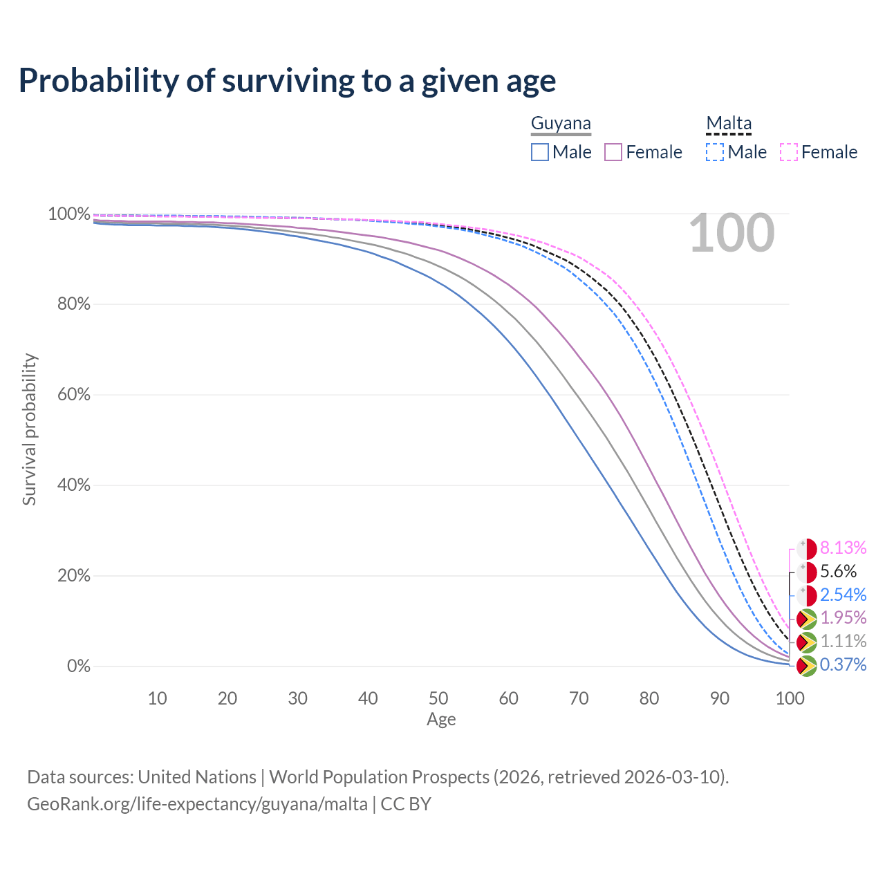 This life expectancy calculator shows the odds of living to 100, 95, 90, and below based on current age for both males and females in Guyana and Malta, along with mean and median age of death. The calculations are based on the 2026 life tables (actuarial tables) from the UN World Population Prospects.