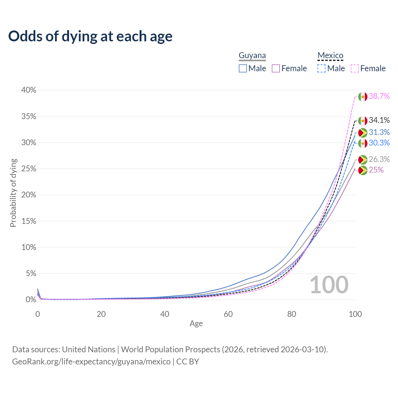 This life expectancy calculator shows the odds of living to 100, 95, 90, and below based on current age for both males and females in Guyana and Mexico, along with mean and median age of death. The calculations are based on the 2026 life tables (actuarial tables) from the UN World Population Prospects.