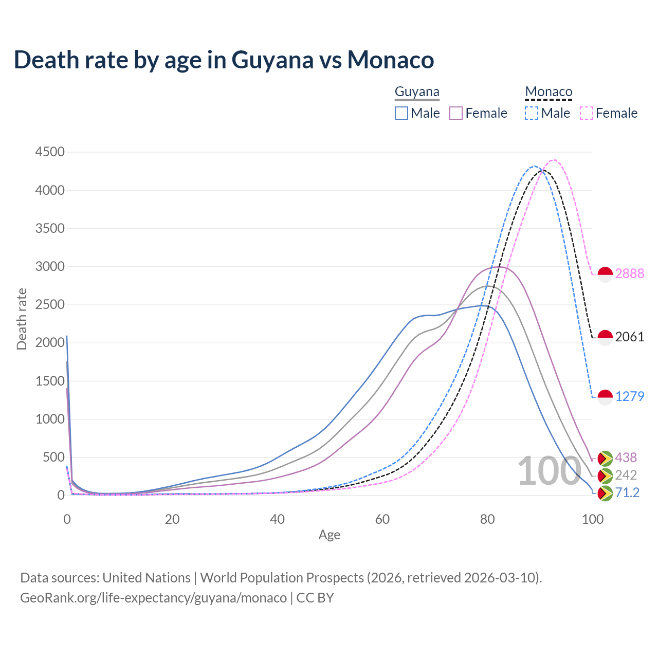 In Guyana, the most common age of death is 80, compared to 91 in Monaco. The median age of death is 74.1 in Guyana and 88.7 in Monaco, meaning only half of each cohort is expected to live past that age.