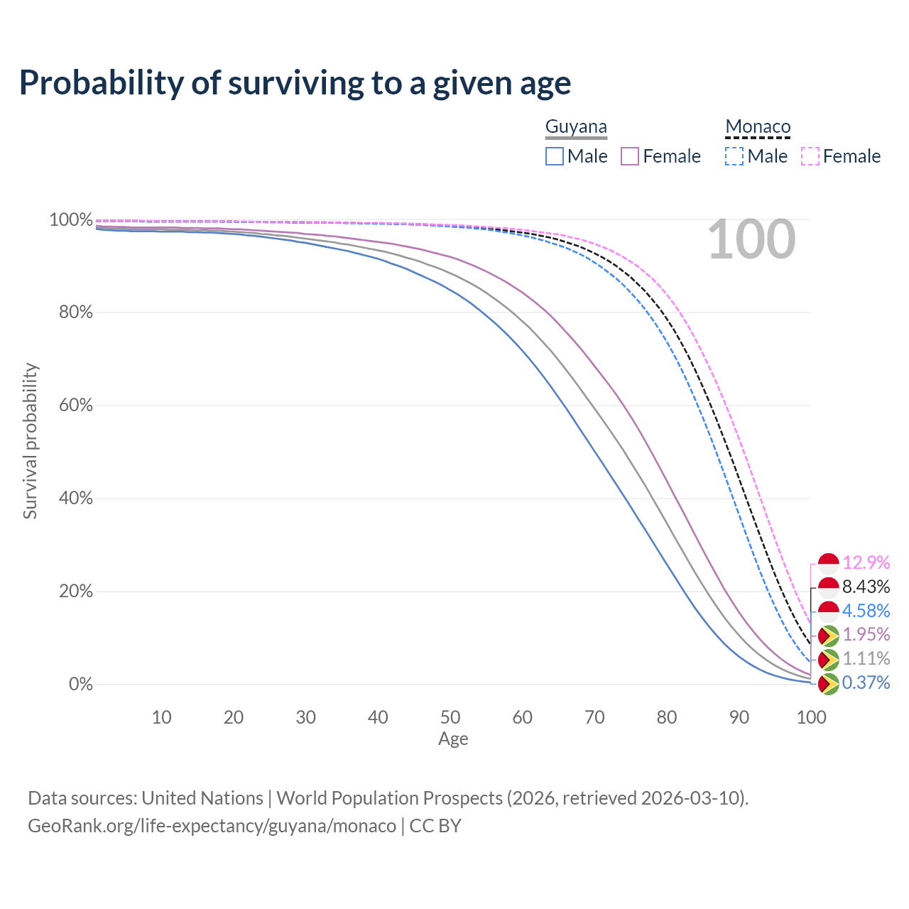 This life expectancy calculator shows the odds of living to 100, 95, 90, and below based on current age for both males and females in Guyana and Monaco, along with mean and median age of death. The calculations are based on the 2026 life tables (actuarial tables) from the UN World Population Prospects.
