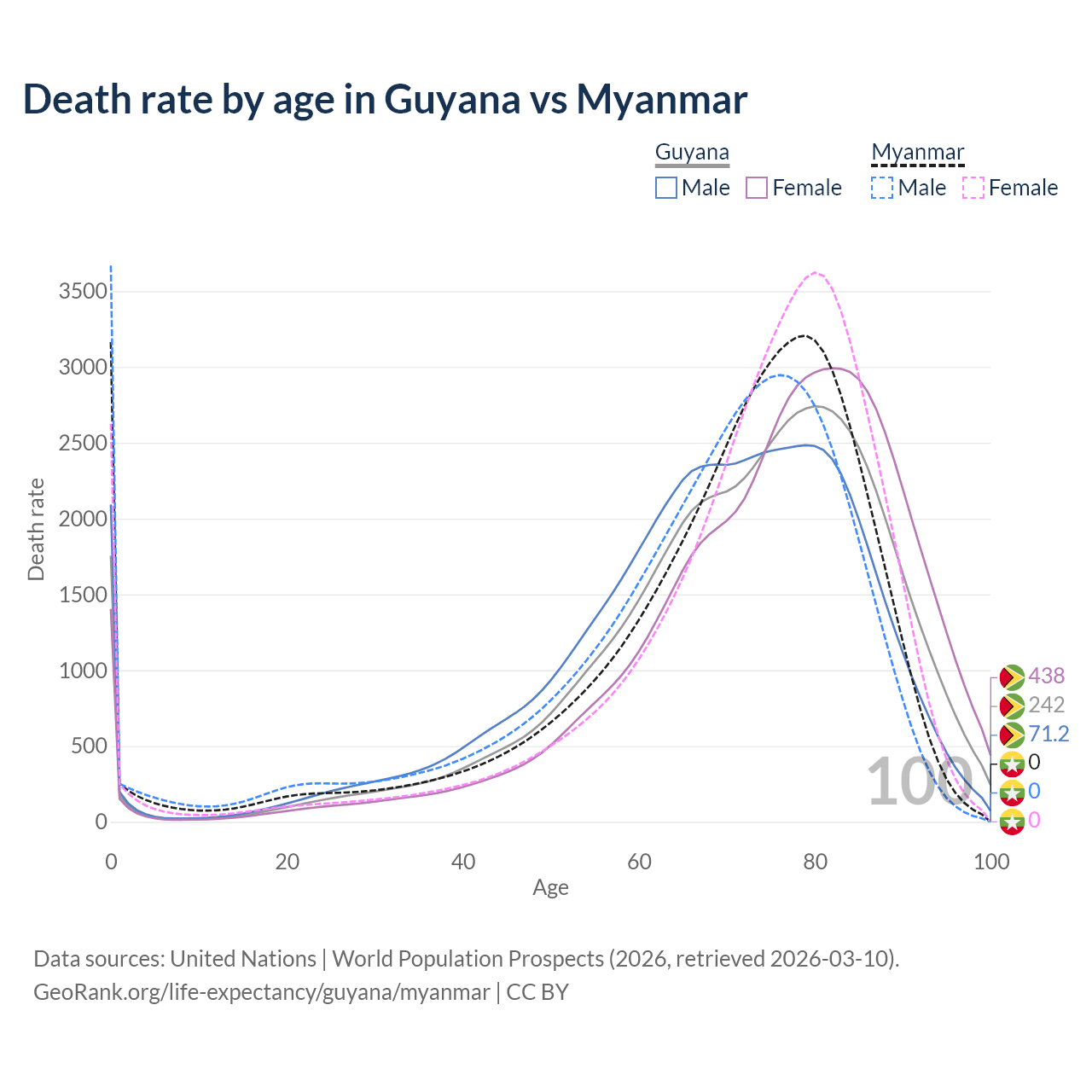 The average life expectancy at birth is 70.6 years in Guyana vs 67.5 in Myanmar. Guyana is ranked 134/197 by life expectancy, and Myanmar is 157/197. In Guyana, the life expectancy is 66.8 years for males and 74.4 years for females. In Myanmar, it's 64.4 years for males and 70.8 years for females.