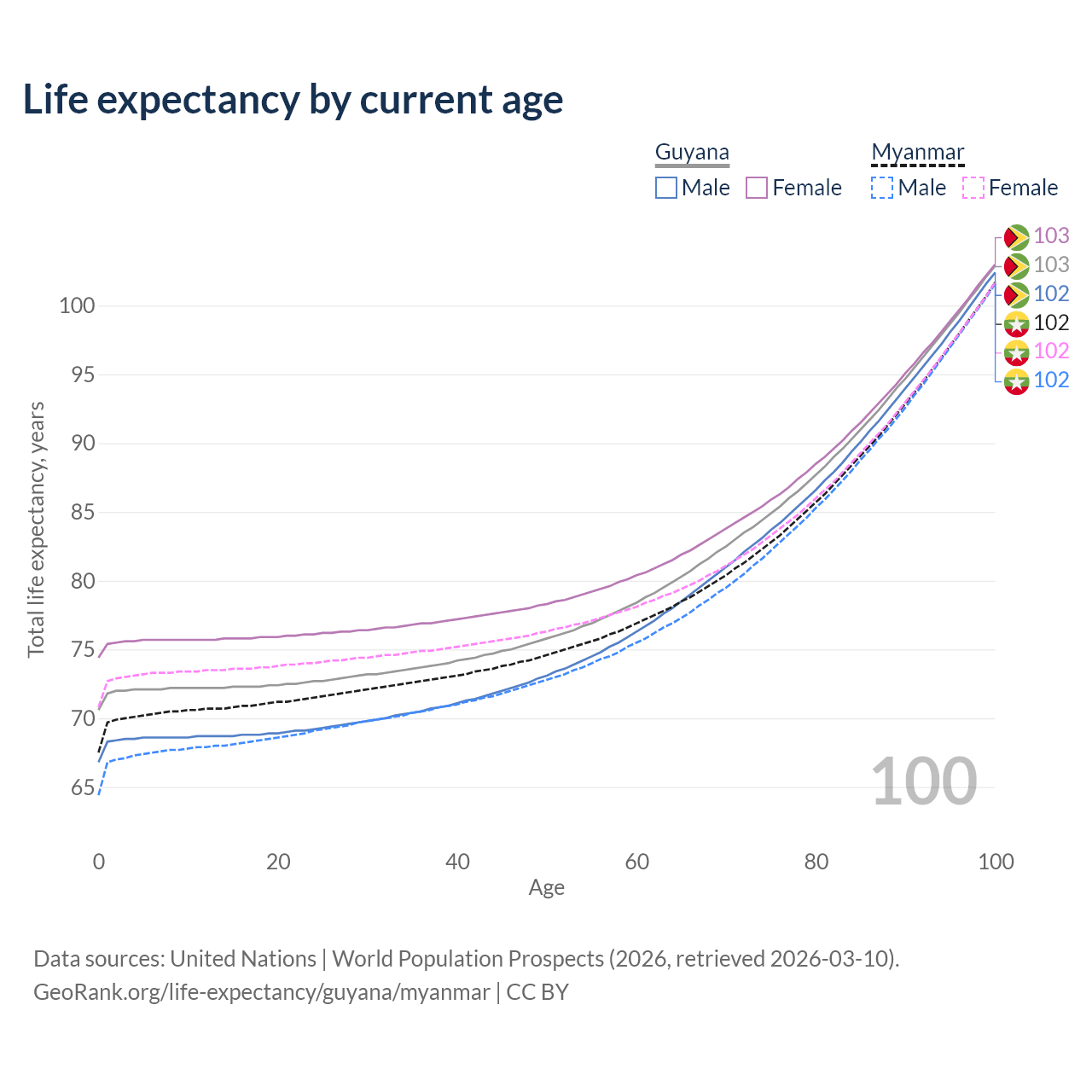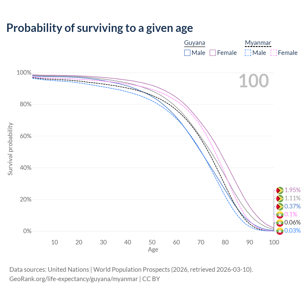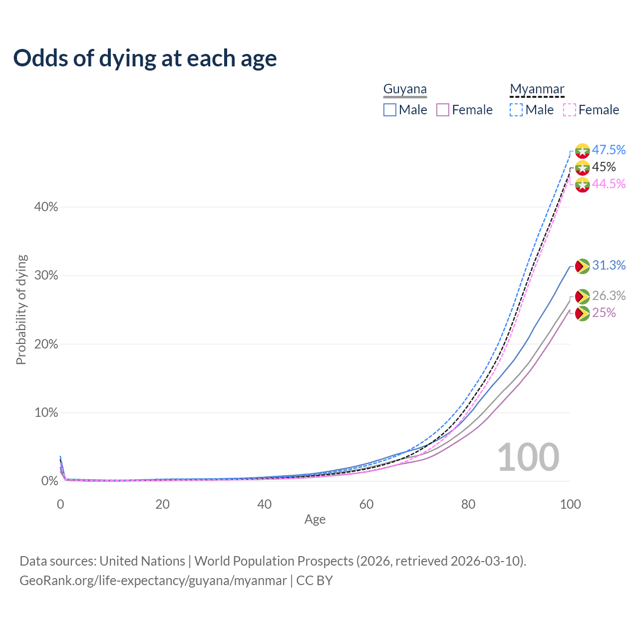This life expectancy calculator shows the odds of living to 100, 95, 90, and below based on current age for both males and females in Guyana and Myanmar, along with mean and median age of death. The calculations are based on the 2026 life tables (actuarial tables) from the UN World Population Prospects.