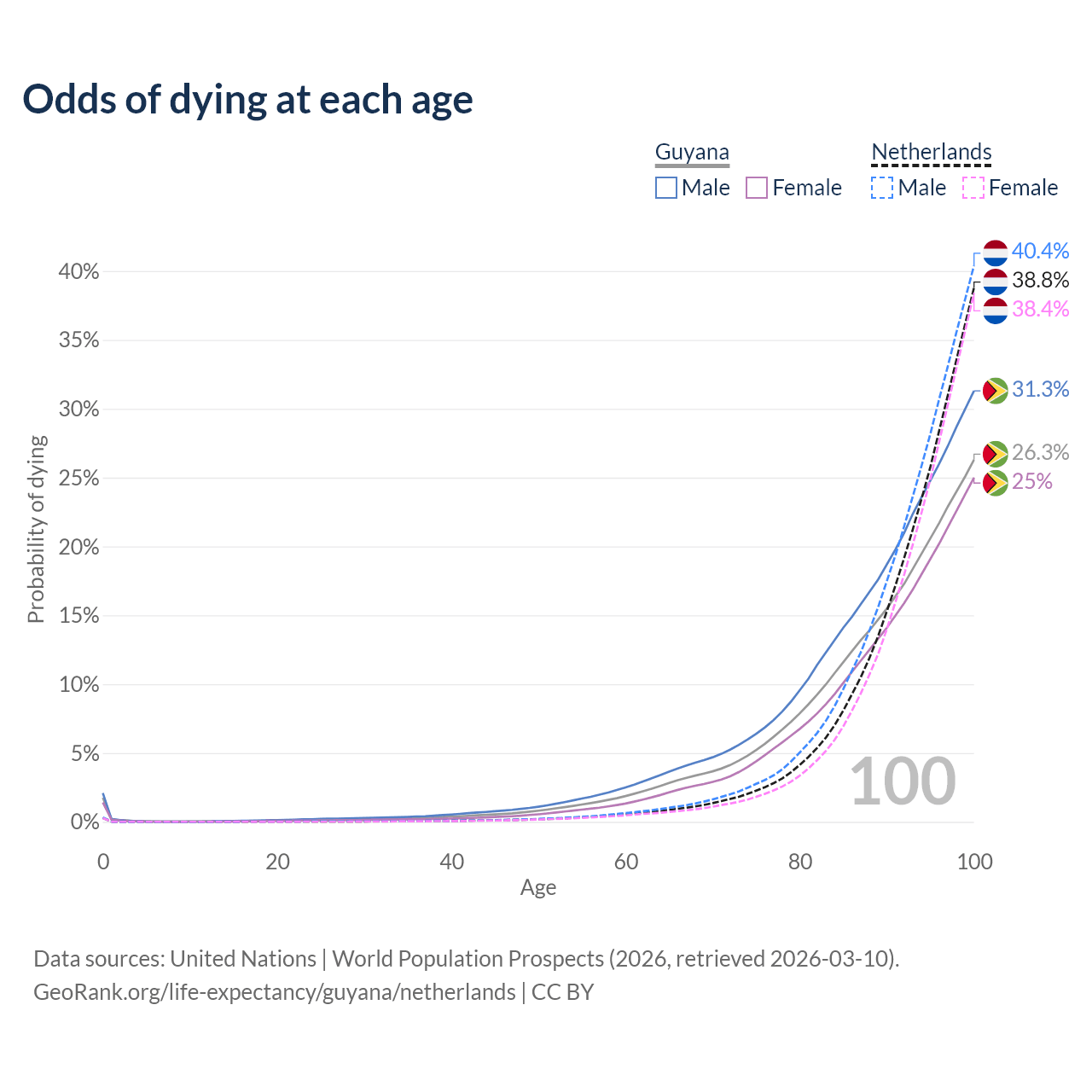 This life expectancy calculator shows the odds of living to 100, 95, 90, and below based on current age for both males and females in Guyana and the Netherlands, along with mean and median age of death. The calculations are based on the 2026 life tables (actuarial tables) from the UN World Population Prospects.