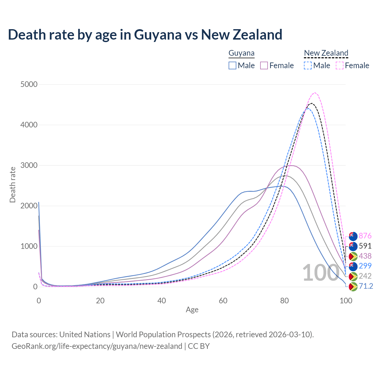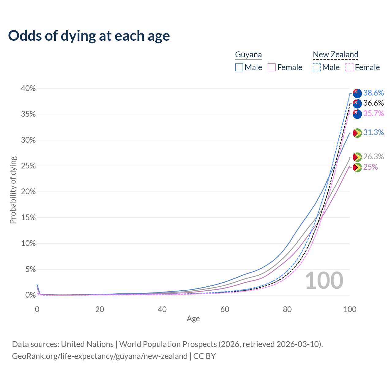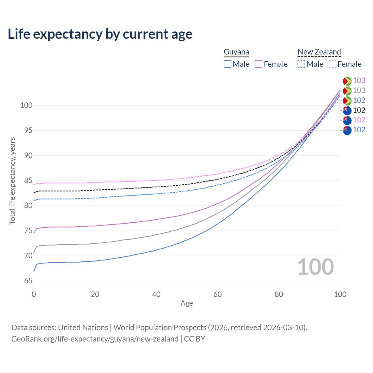 This life expectancy calculator shows the odds of living to 100, 95, 90, and below based on current age for both males and females in Guyana and New Zealand, along with mean and median age of death. The calculations are based on the 2026 life tables (actuarial tables) from the UN World Population Prospects.