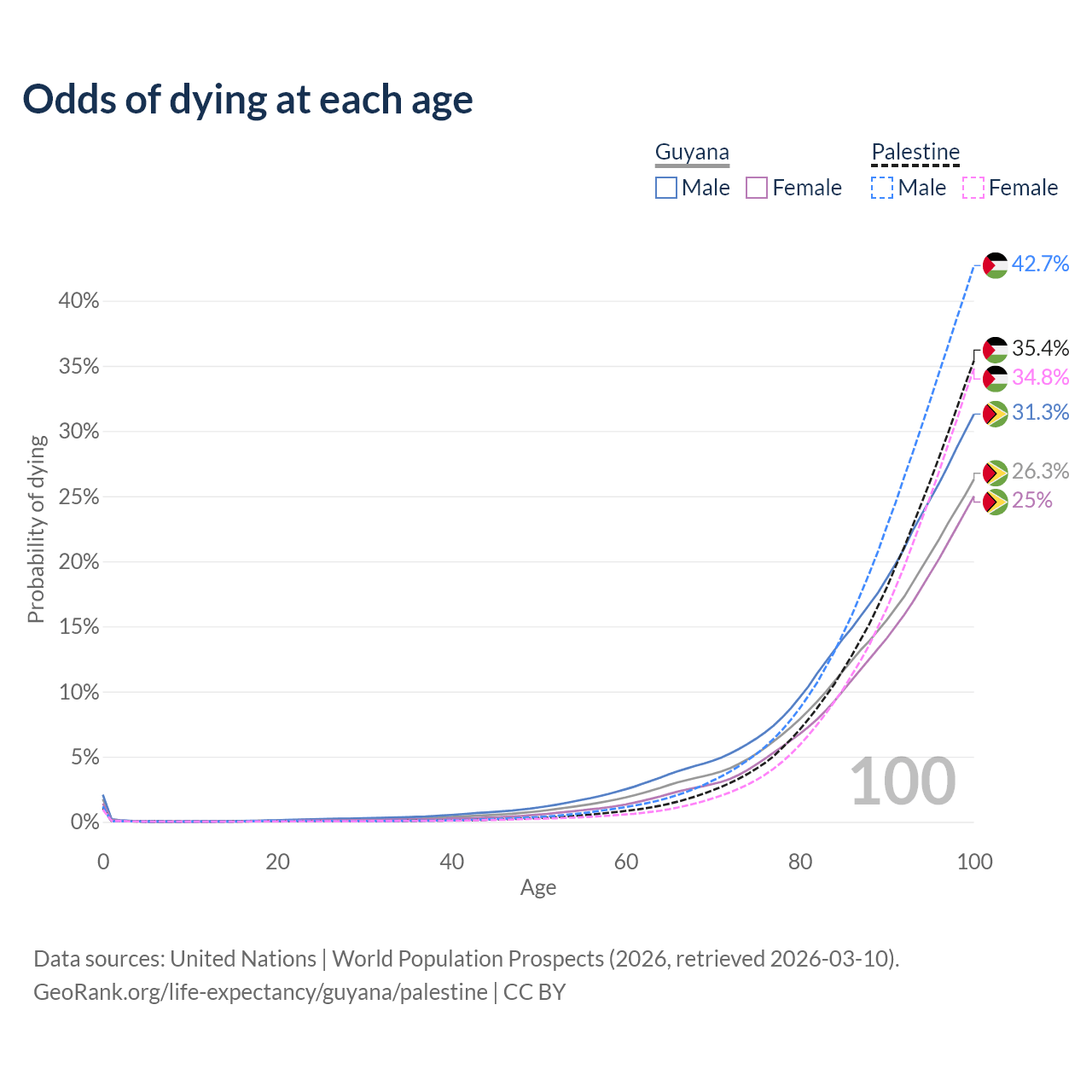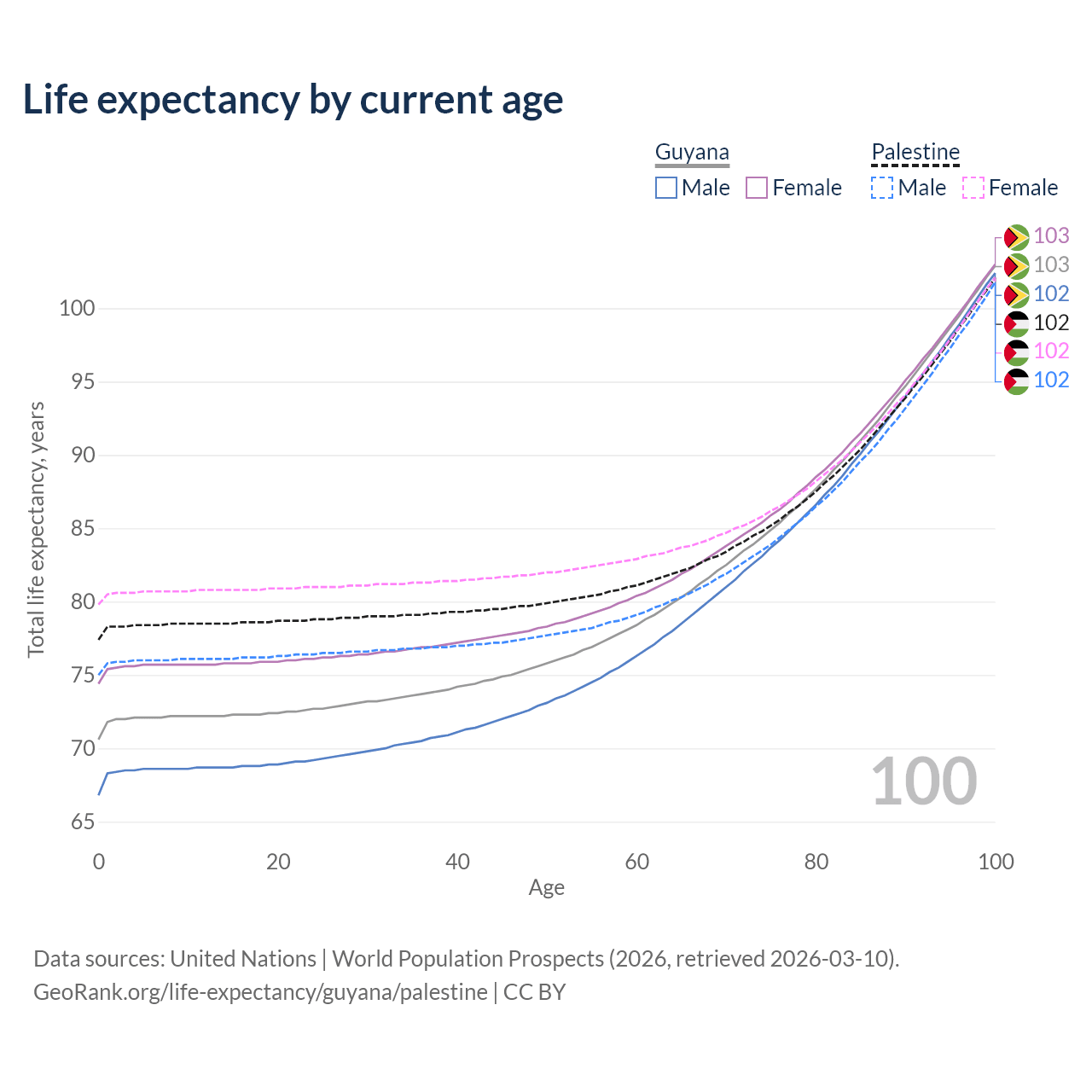This life expectancy calculator shows the odds of living to 100, 95, 90, and below based on current age for both males and females in Guyana and Palestine, along with mean and median age of death. The calculations are based on the 2026 life tables (actuarial tables) from the UN World Population Prospects.