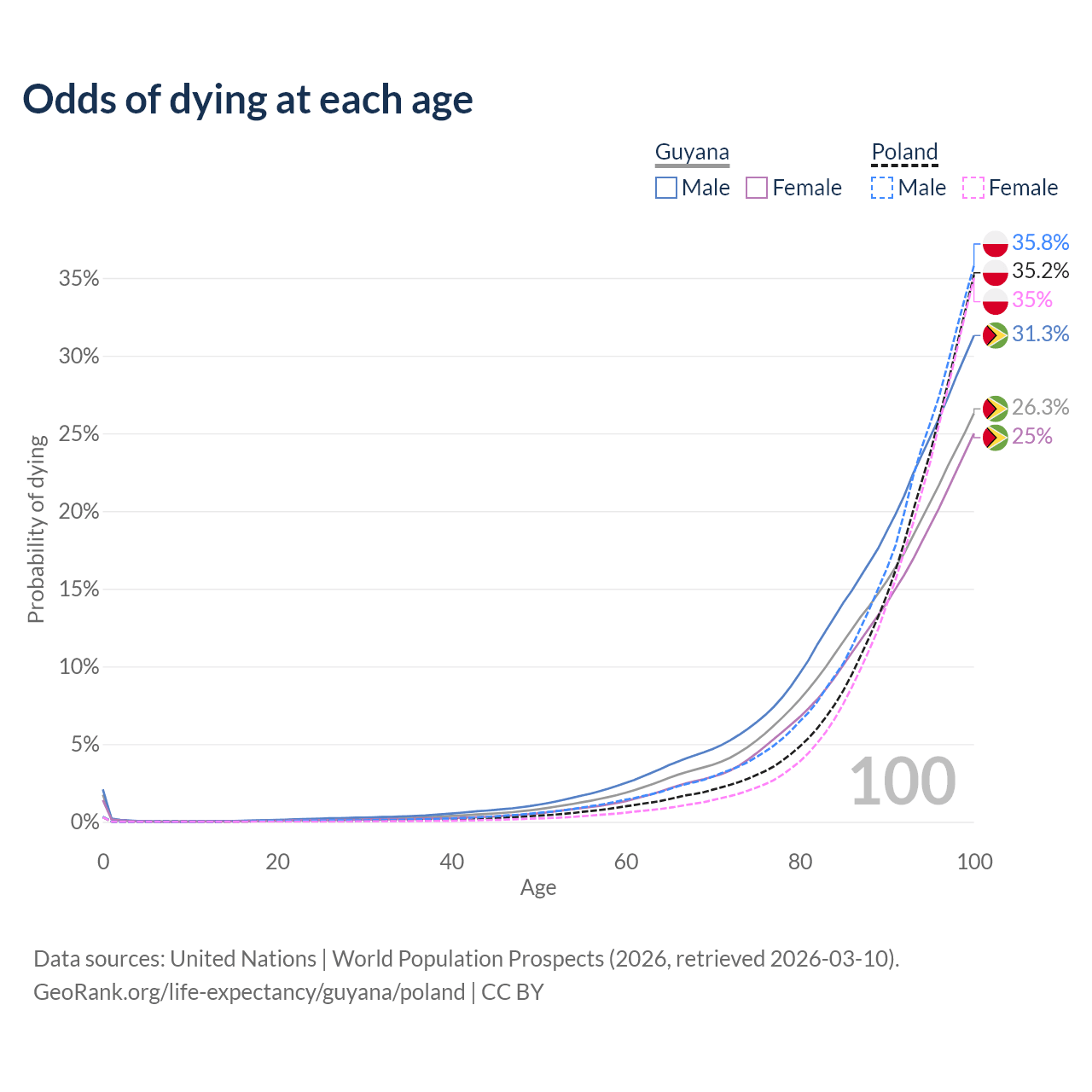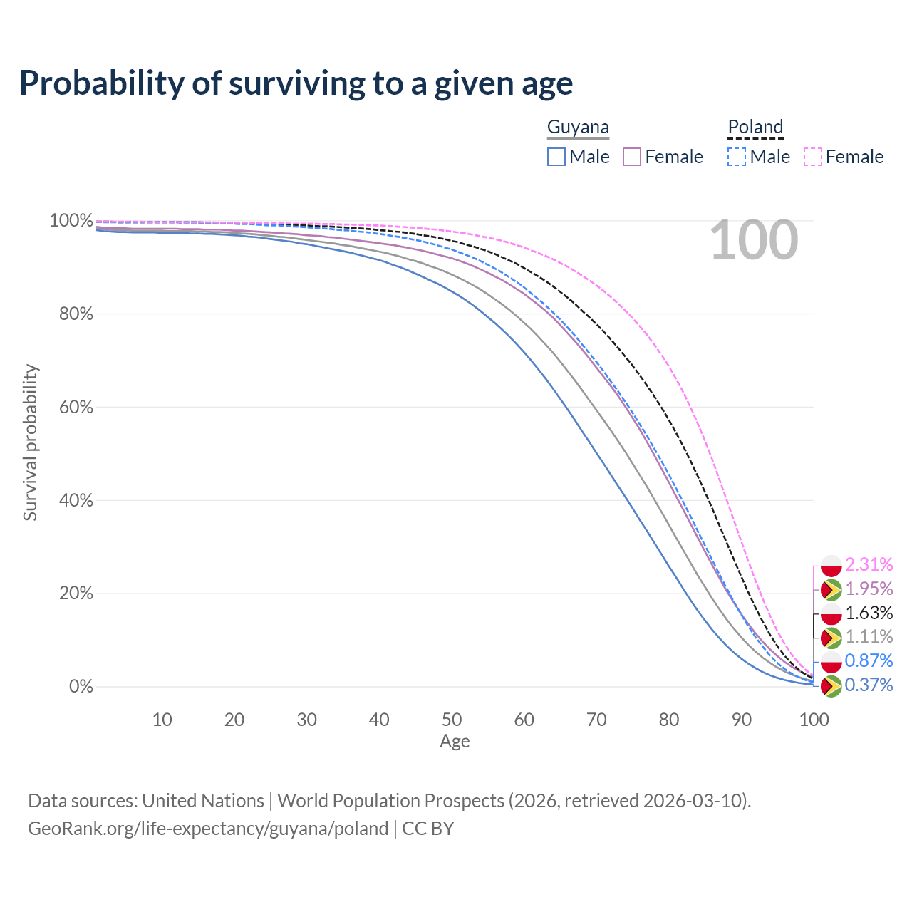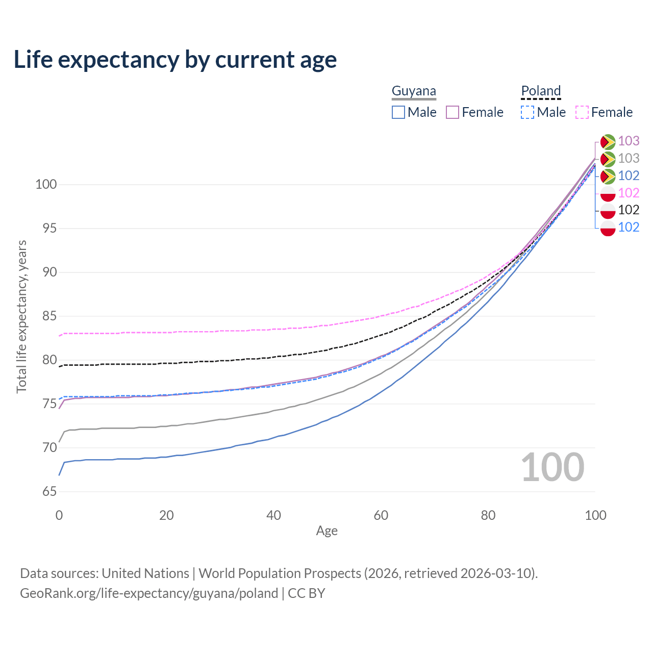 This life expectancy calculator shows the odds of living to 100, 95, 90, and below based on current age for both males and females in Guyana and Poland, along with mean and median age of death. The calculations are based on the 2026 life tables (actuarial tables) from the UN World Population Prospects.