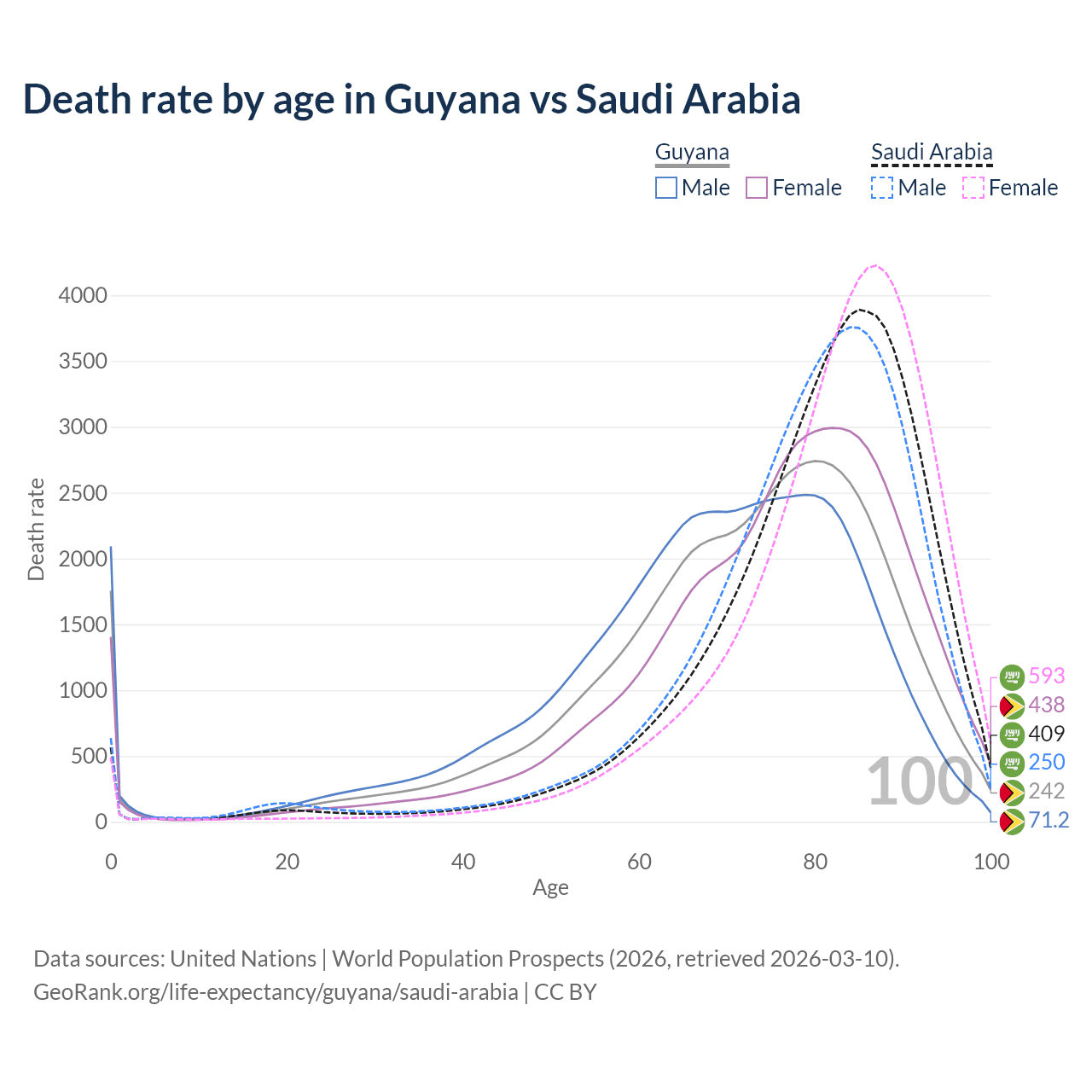 In Guyana, the most common age of death is 80, compared to 85 in Saudi Arabia. The median age of death is 74.1 in Guyana and 82.5 in Saudi Arabia, meaning only half of each cohort is expected to live past that age.