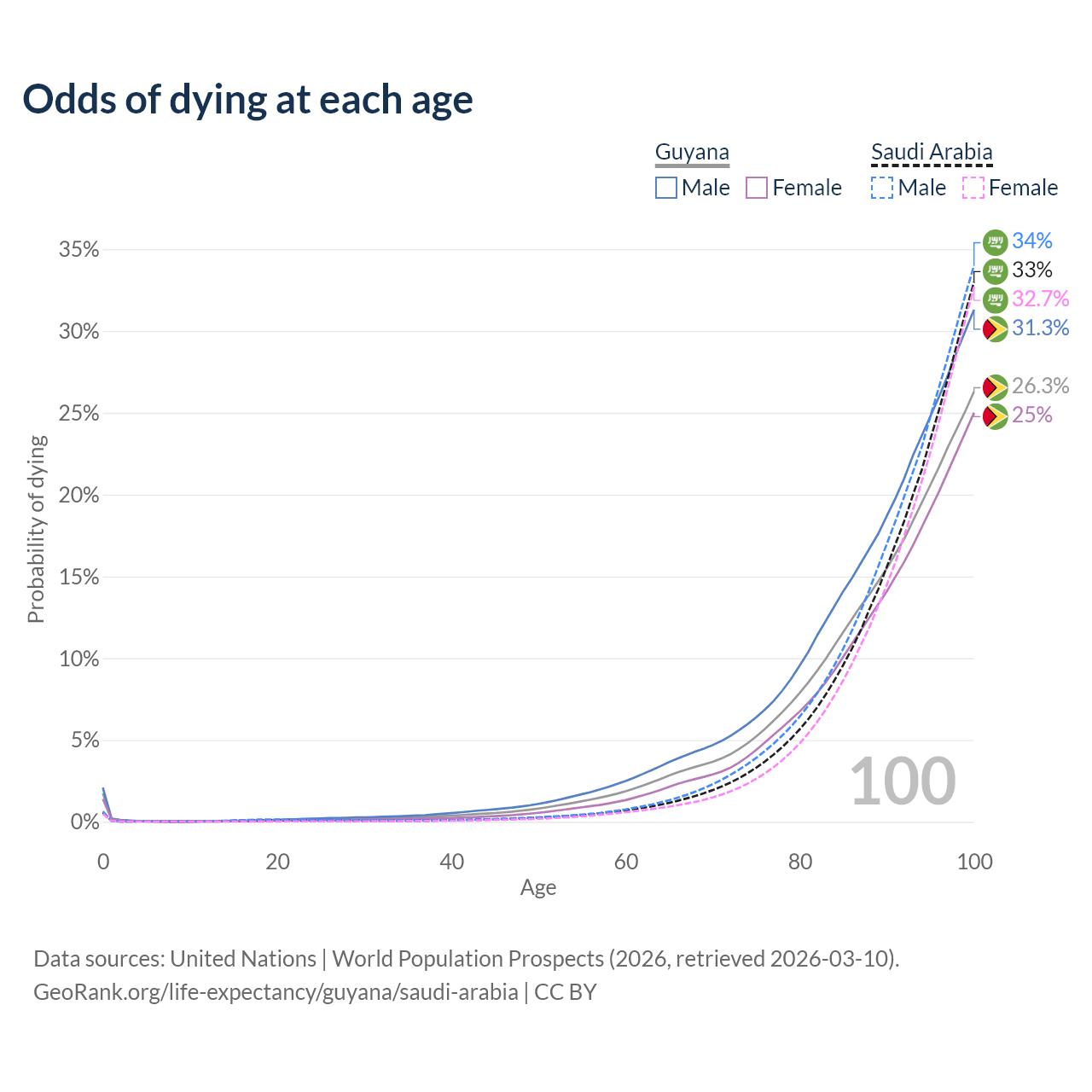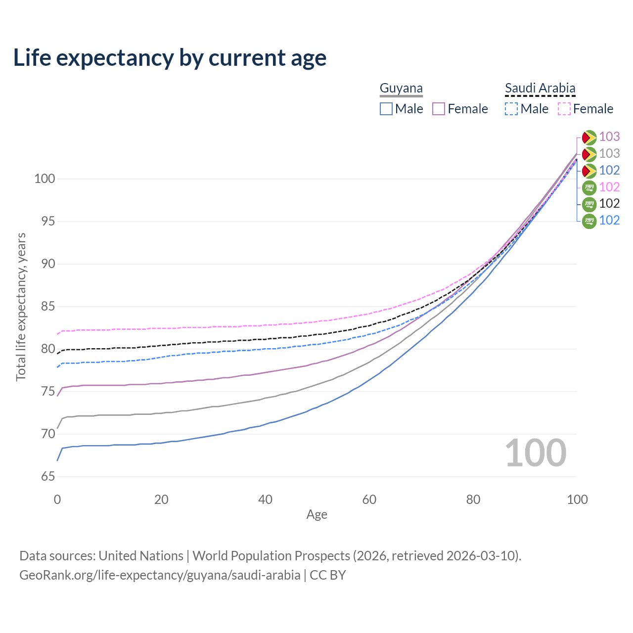 This life expectancy calculator shows the odds of living to 100, 95, 90, and below based on current age for both males and females in Guyana and Saudi Arabia, along with mean and median age of death. The calculations are based on the 2026 life tables (actuarial tables) from the UN World Population Prospects.