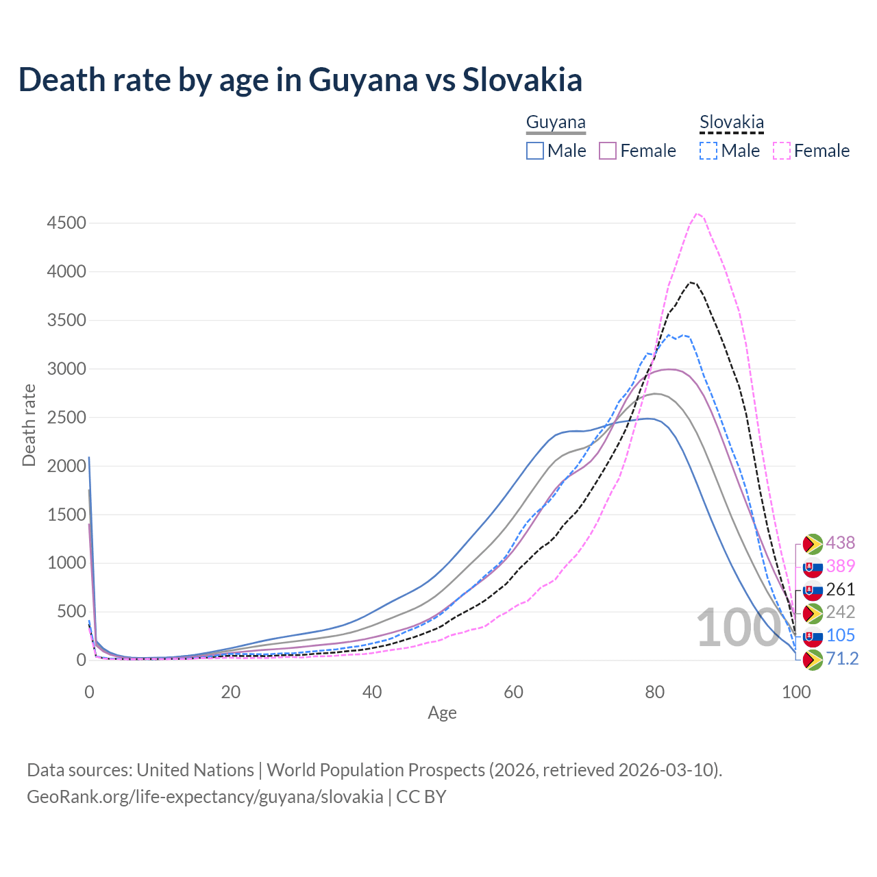 In Guyana, the most common age of death is 80, compared to 85 in Slovakia. The median age of death is 74.1 in Guyana and 82 in Slovakia, meaning only half of each cohort is expected to live past that age.