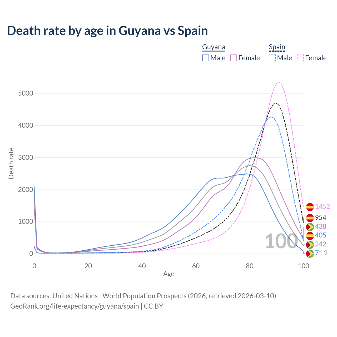 In Guyana, the most common age of death is 80, compared to 90 in Spain. The median age of death is 74.1 in Guyana and 87 in Spain, meaning only half of each cohort is expected to live past that age.