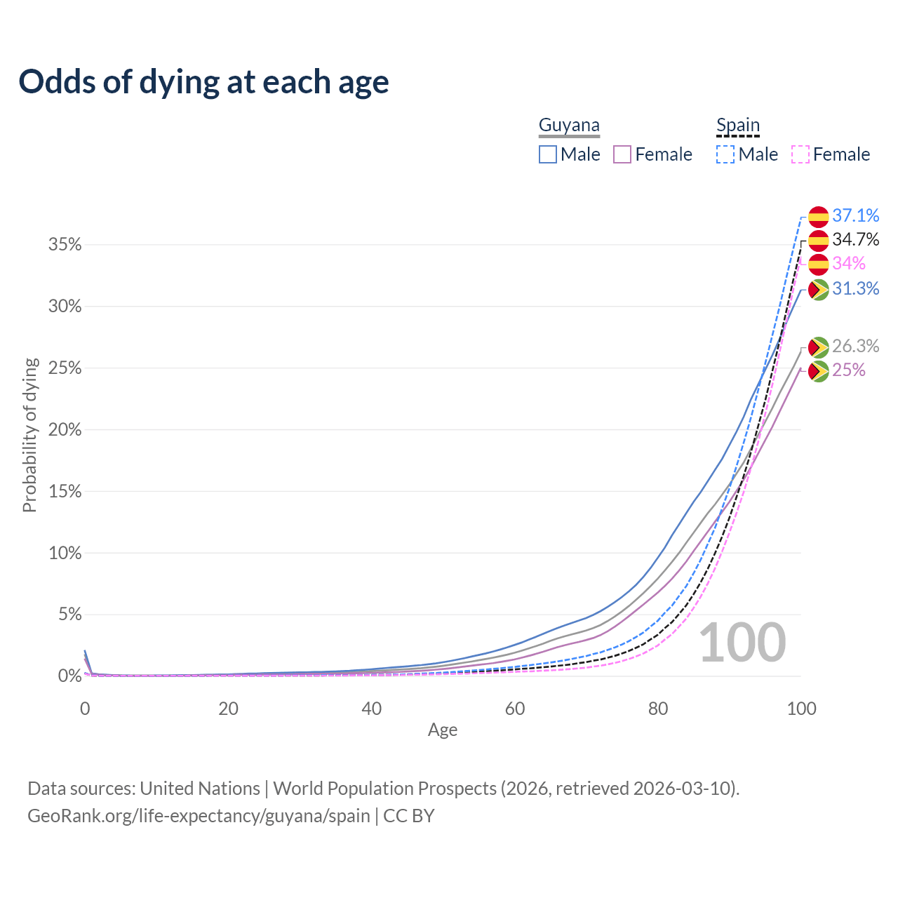 This life expectancy calculator shows the odds of living to 100, 95, 90, and below based on current age for both males and females in Guyana and Spain, along with mean and median age of death. The calculations are based on the 2026 life tables (actuarial tables) from the UN World Population Prospects.