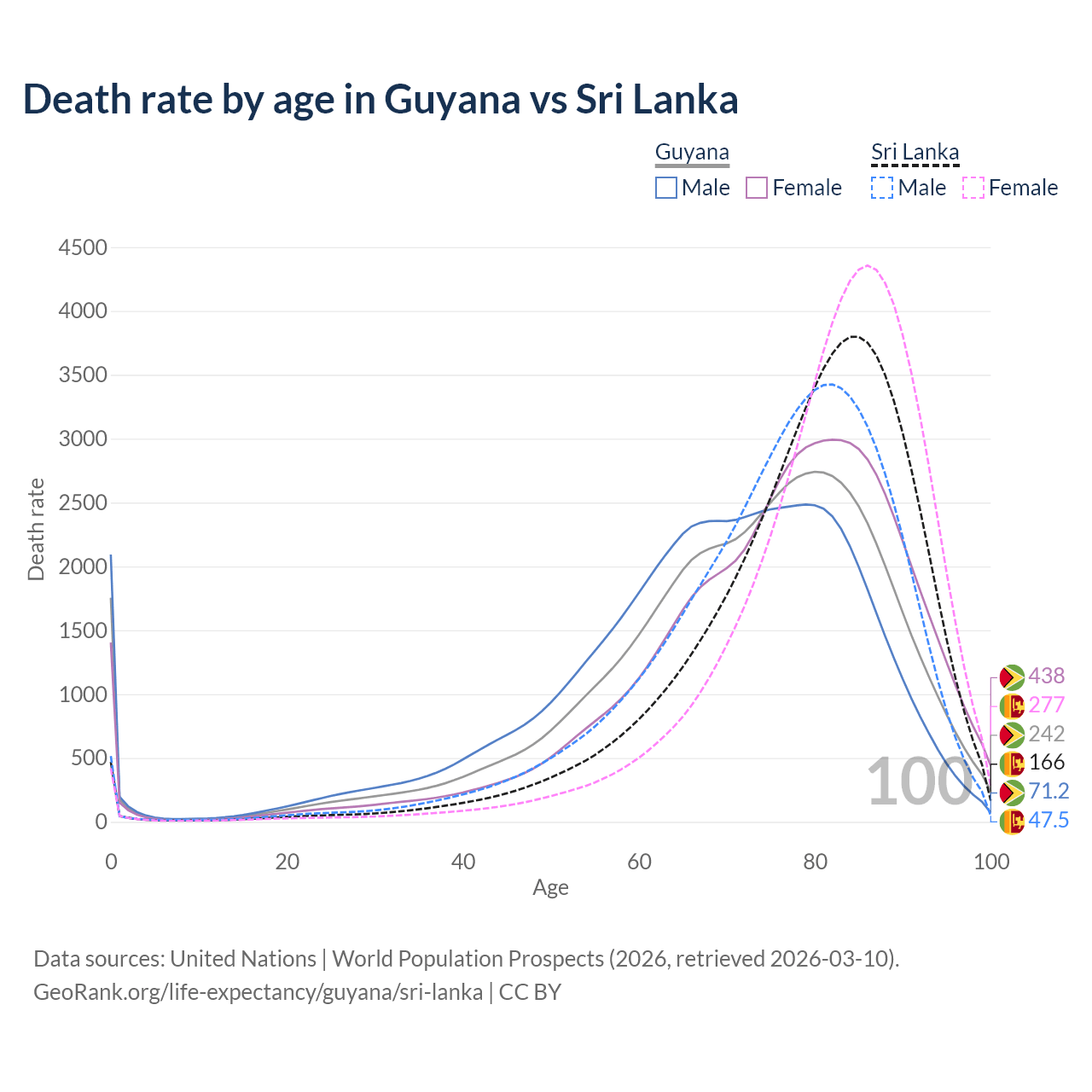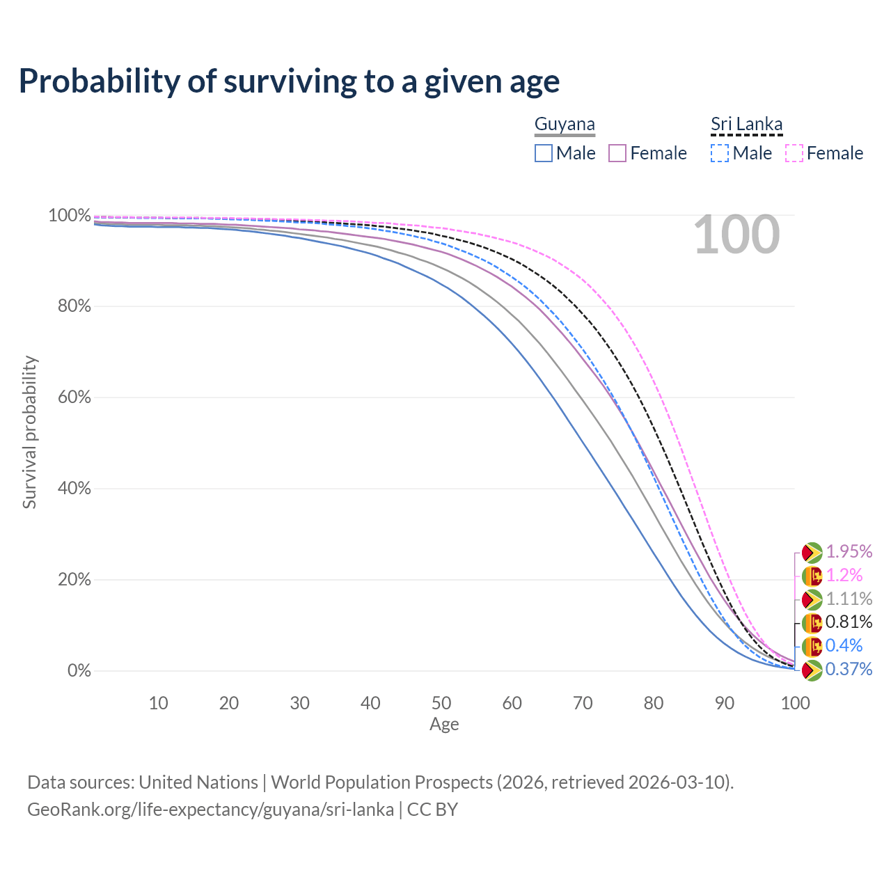 This life expectancy calculator shows the odds of living to 100, 95, 90, and below based on current age for both males and females in Guyana and Sri Lanka, along with mean and median age of death. The calculations are based on the 2026 life tables (actuarial tables) from the UN World Population Prospects.