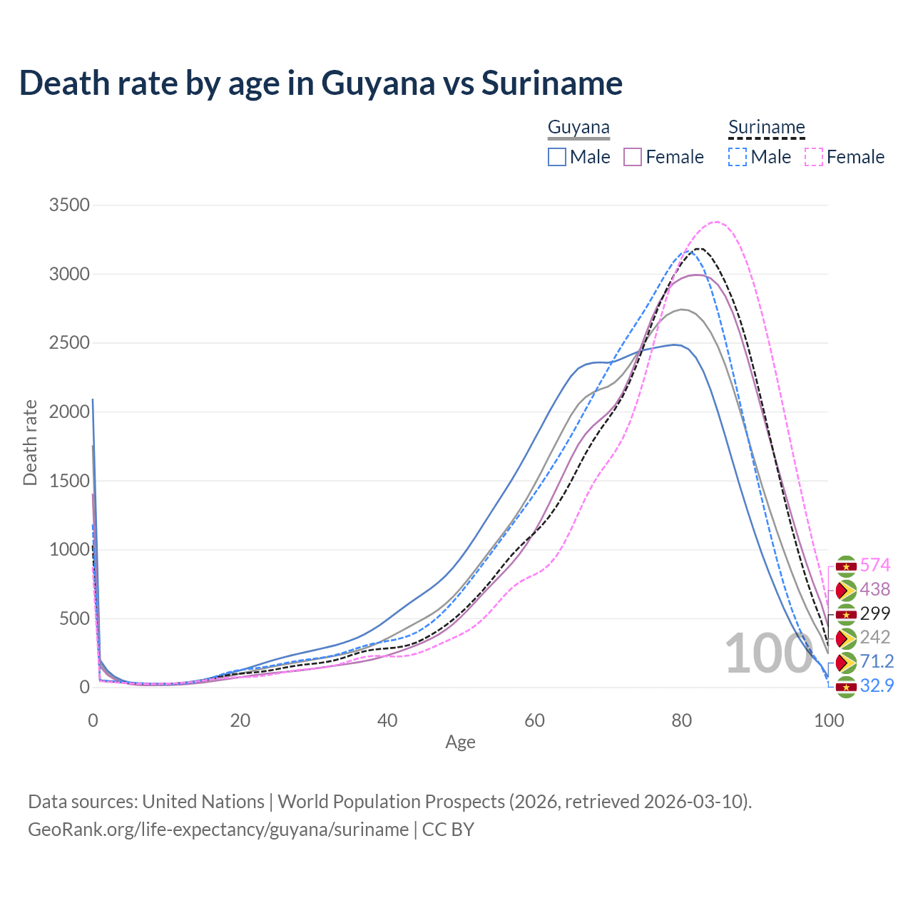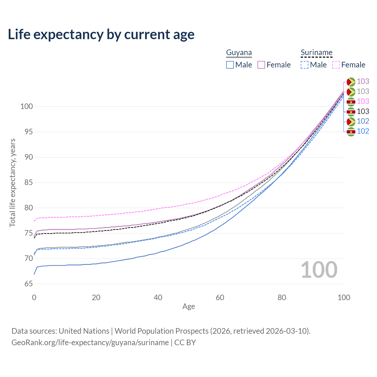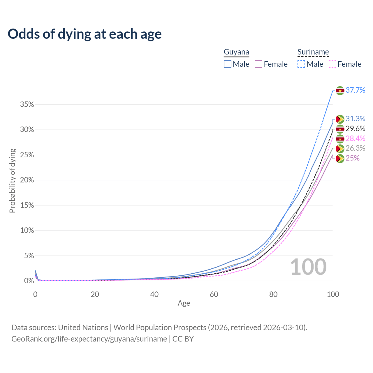 This life expectancy calculator shows the odds of living to 100, 95, 90, and below based on current age for both males and females in Guyana and Suriname, along with mean and median age of death. The calculations are based on the 2026 life tables (actuarial tables) from the UN World Population Prospects.