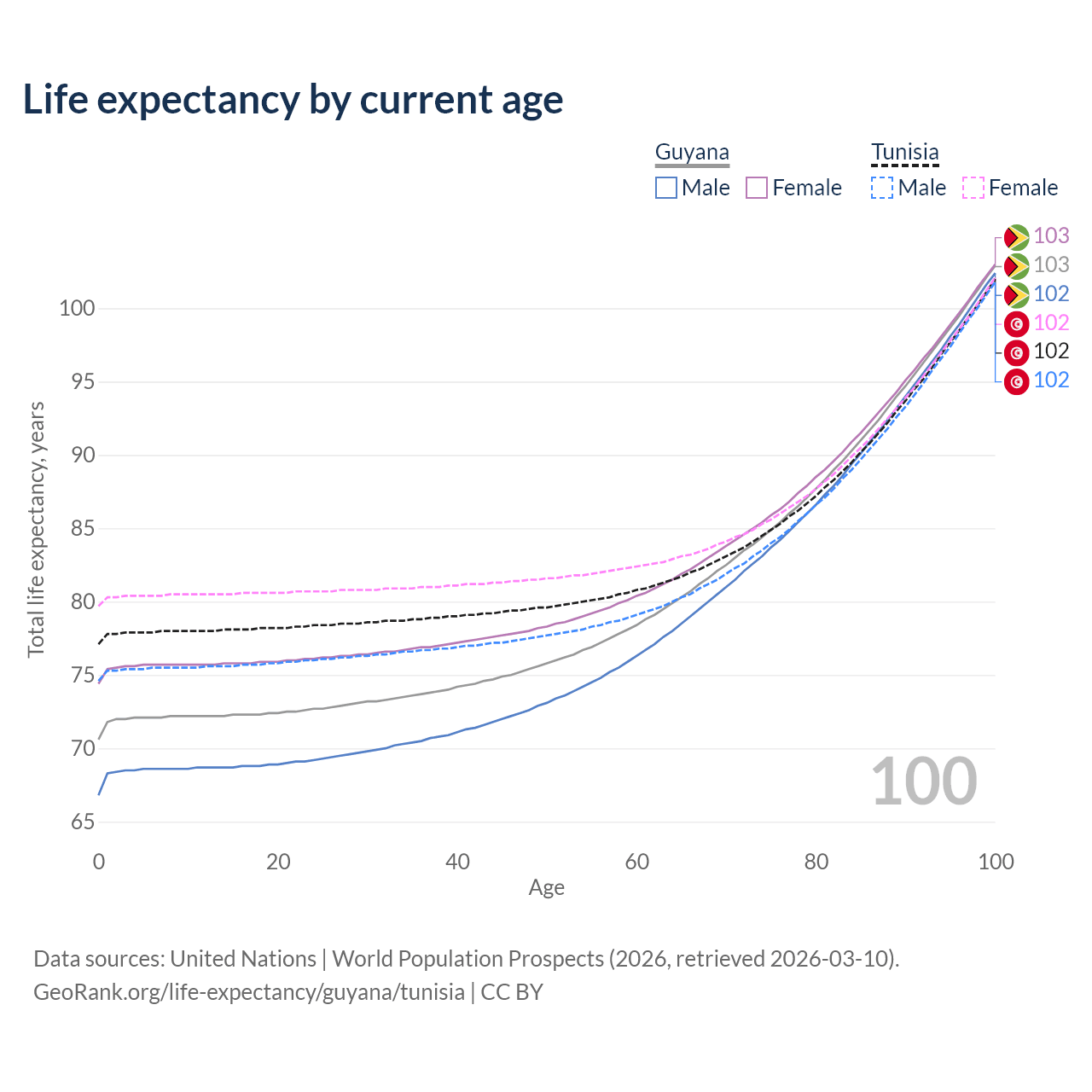 This life expectancy calculator shows the odds of living to 100, 95, 90, and below based on current age for both males and females in Guyana and Tunisia, along with mean and median age of death. The calculations are based on the 2026 life tables (actuarial tables) from the UN World Population Prospects.