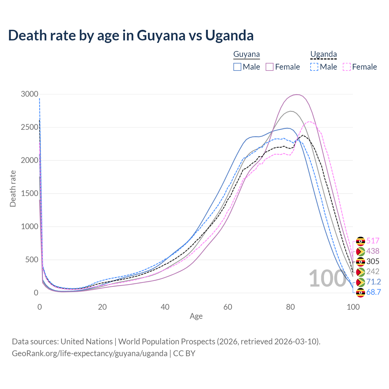 In Guyana, the most common age of death is 80, compared to 0 in Uganda. The median age of death is 74.1 in Guyana and 73.3 in Uganda, meaning only half of each cohort is expected to live past that age.
