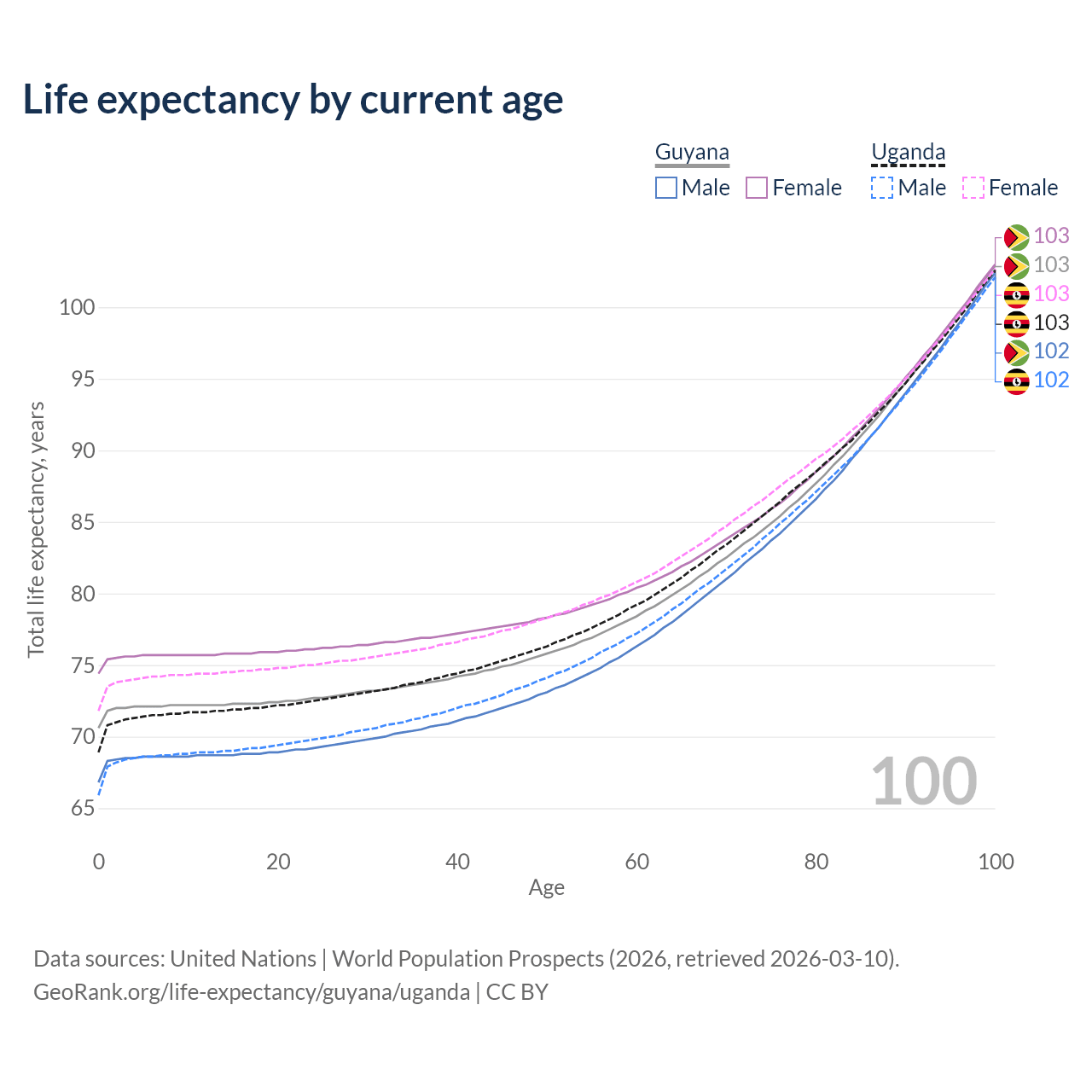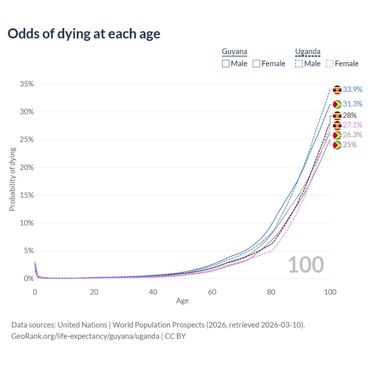 This life expectancy calculator shows the odds of living to 100, 95, 90, and below based on current age for both males and females in Guyana and Uganda, along with mean and median age of death. The calculations are based on the 2026 life tables (actuarial tables) from the UN World Population Prospects.