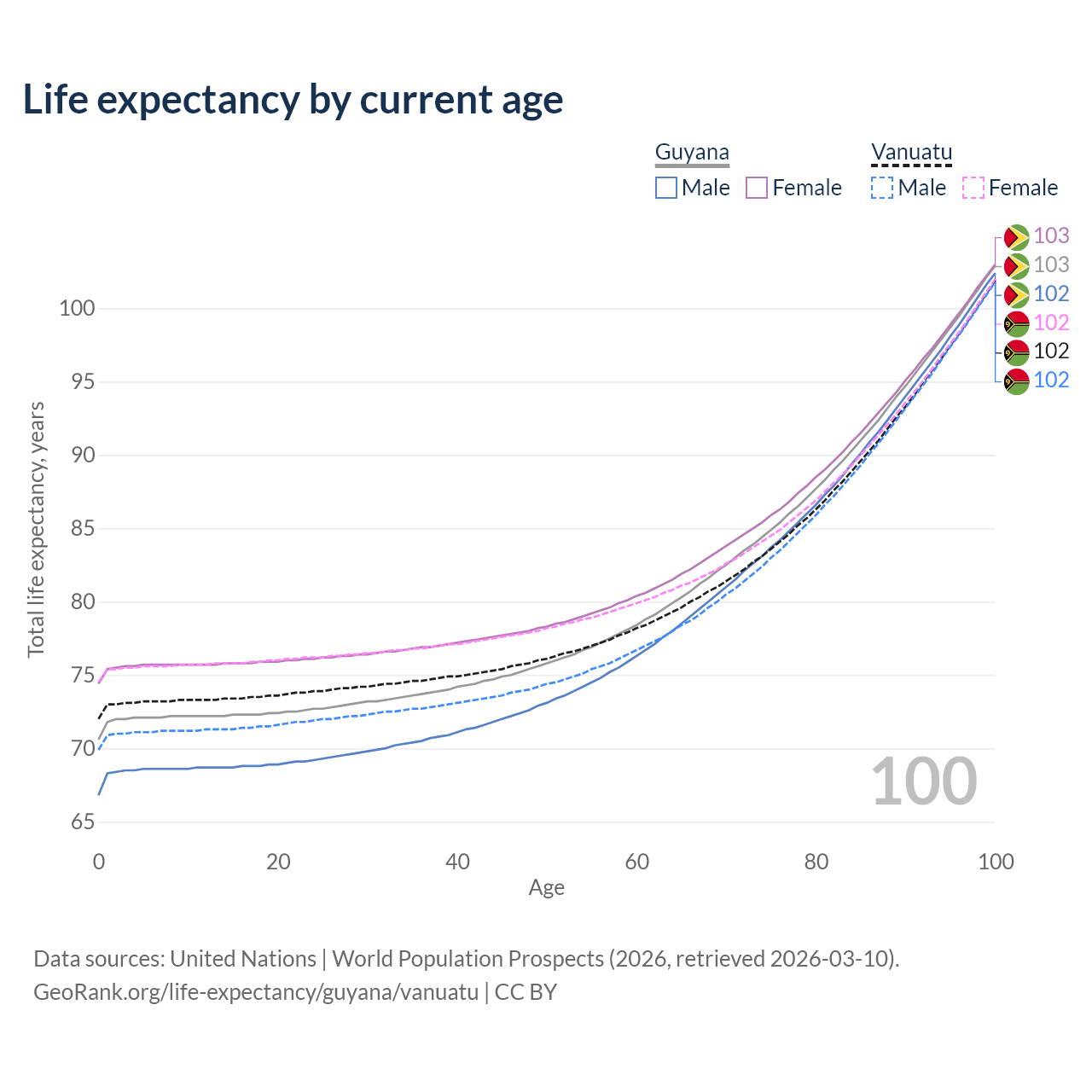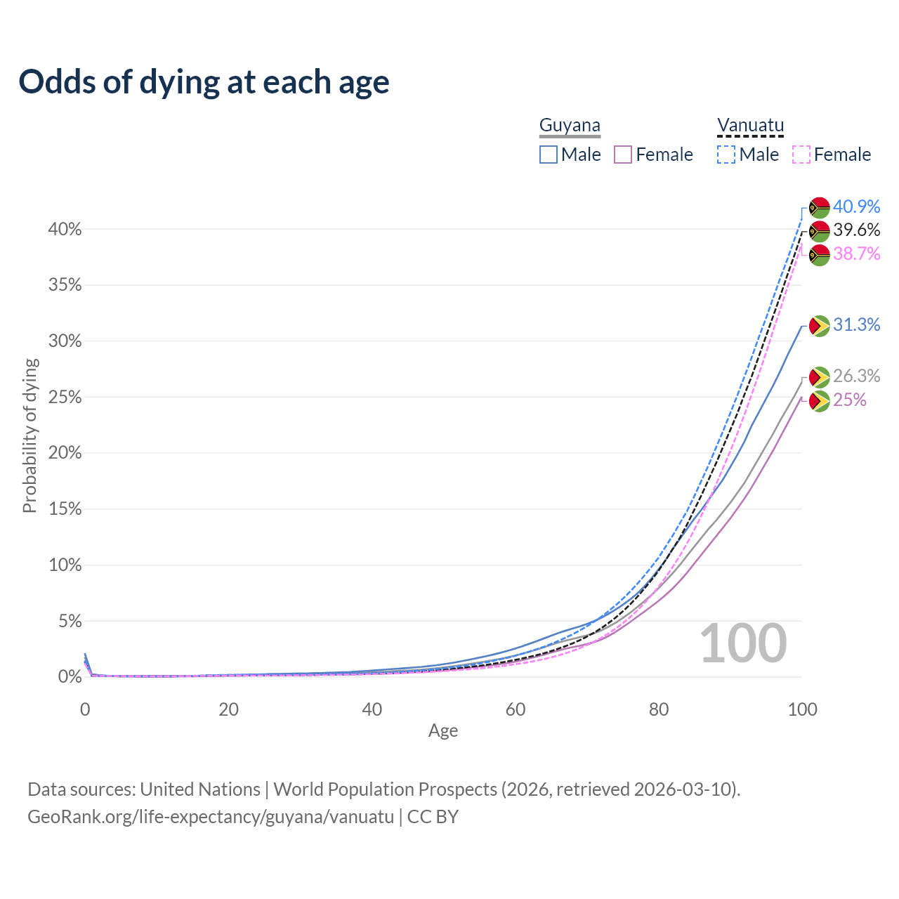 This life expectancy calculator shows the odds of living to 100, 95, 90, and below based on current age for both males and females in Guyana and Vanuatu, along with mean and median age of death. The calculations are based on the 2026 life tables (actuarial tables) from the UN World Population Prospects.