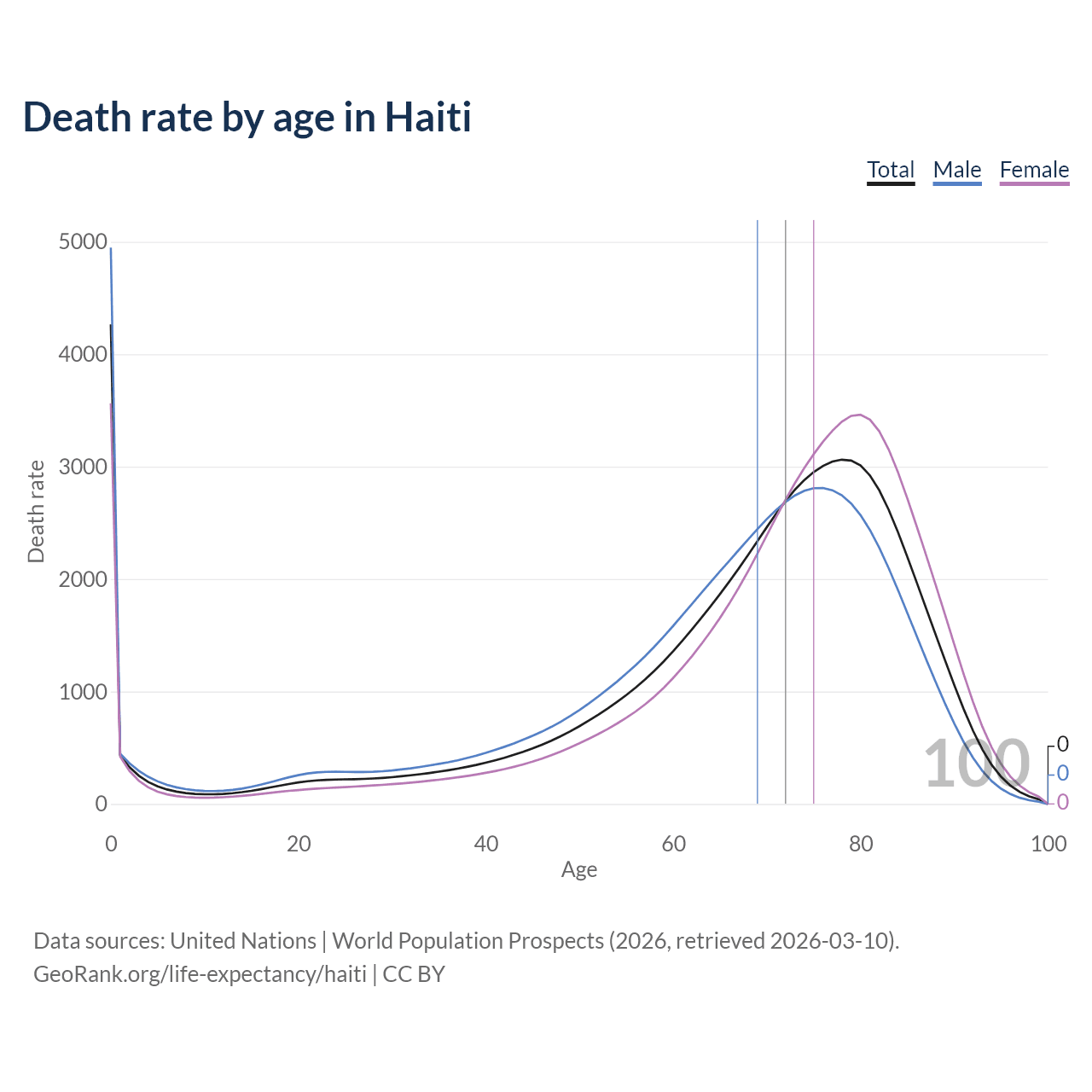 In Haiti, the most probable age of death — the age at which the highest number of deaths occur — is 0 for both sexes combined, 0 for males, and 0 for females. Vertical lines mark the median age of death: 69 for men, 74.8 for women, and 72 combined, meaning only half of each cohort is expected to live past that age.