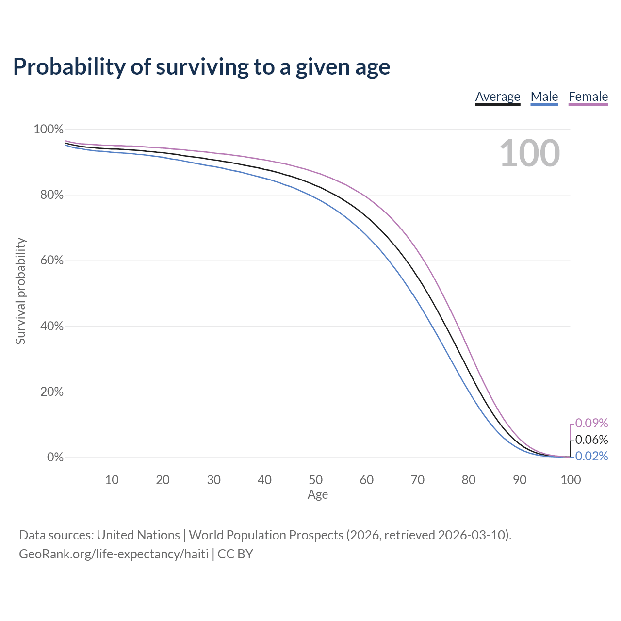 This life expectancy calculator shows the odds of living to 100, 95, 90, and below based on current age for both males and females in Haiti, along with mean and median age of death. The calculations are based on the 2026 life tables (actuarial tables) from the UN World Population Prospects.