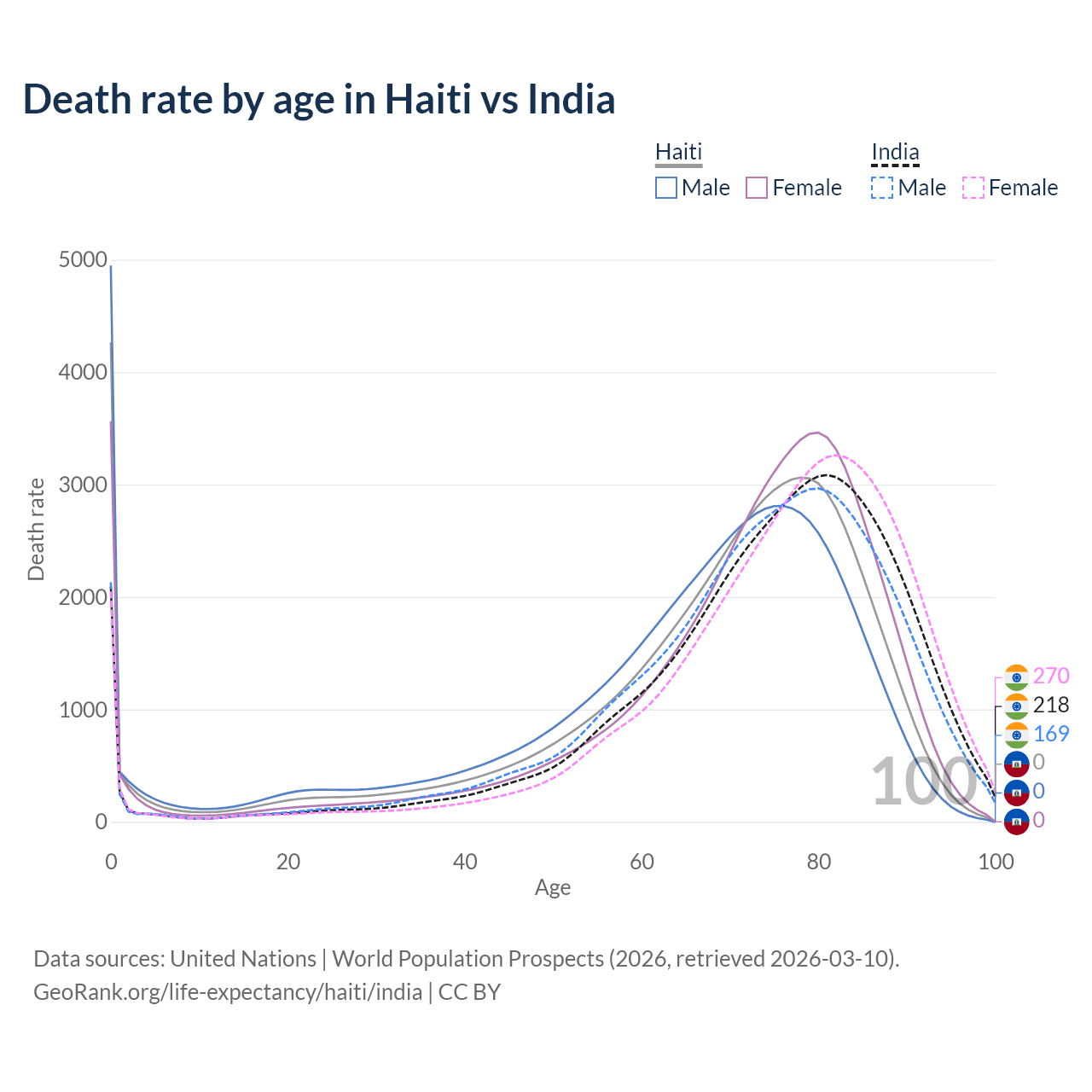 In Haiti, the most common age of death is 0, compared to 81 in India. The median age of death is 72 in Haiti and 76.8 in India, meaning only half of each cohort is expected to live past that age.