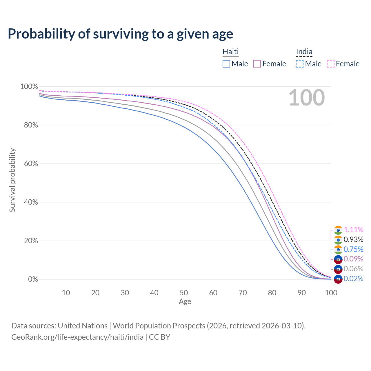 This life expectancy calculator shows the odds of living to 100, 95, 90, and below based on current age for both males and females in Haiti and India, along with mean and median age of death. The calculations are based on the 2026 life tables (actuarial tables) from the UN World Population Prospects.