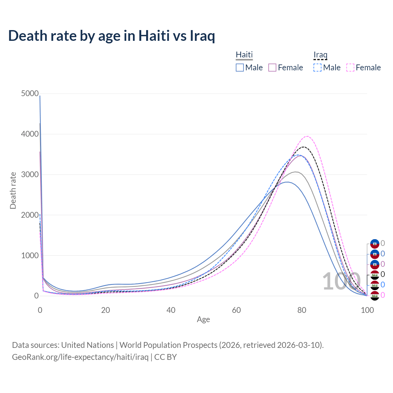 In Haiti, the most common age of death is 0, compared to 81 in Iraq. The median age of death is 72 in Haiti and 76.7 in Iraq, meaning only half of each cohort is expected to live past that age.