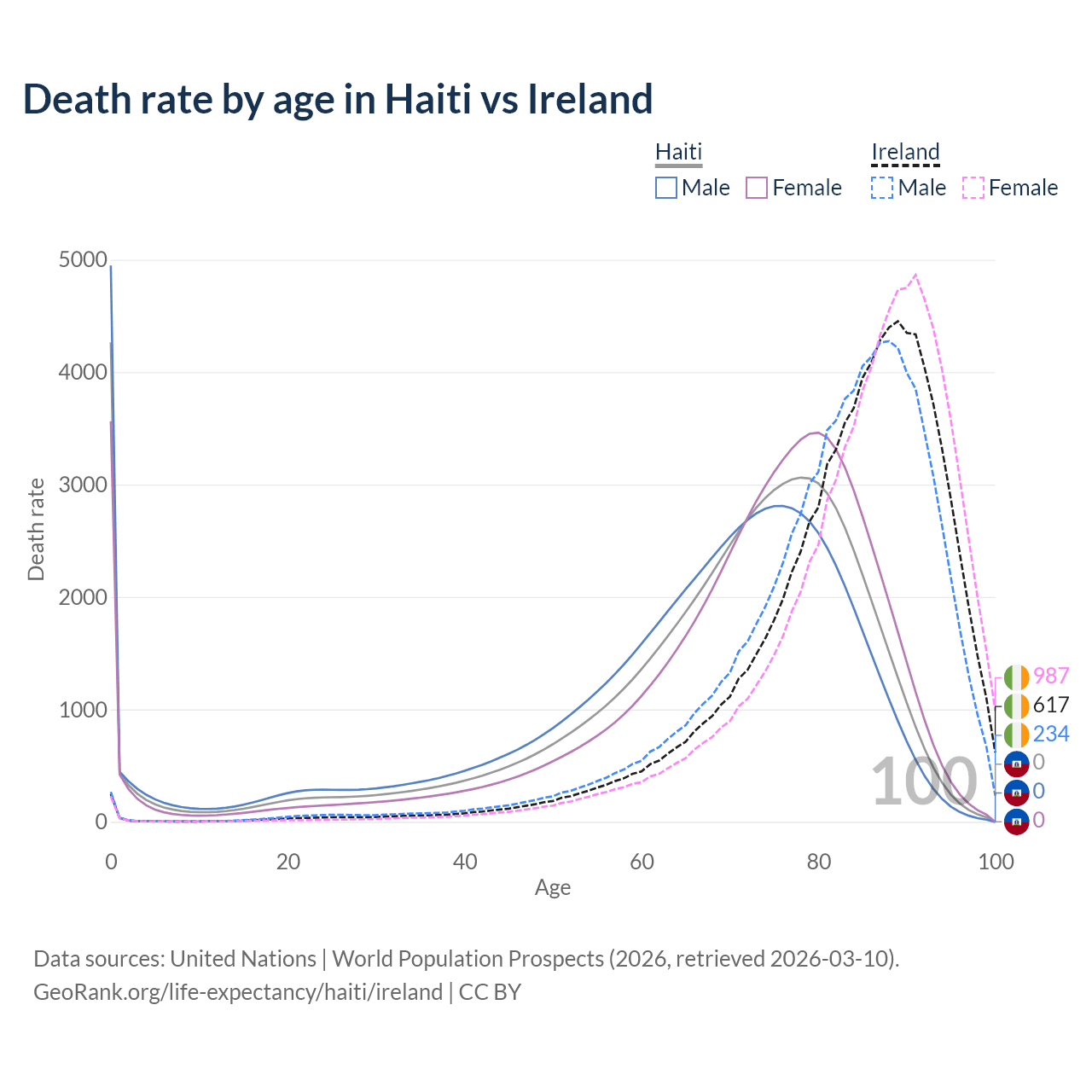 In Haiti, the most common age of death is 0, compared to 89 in Ireland. The median age of death is 72 in Haiti and 85.7 in Ireland, meaning only half of each cohort is expected to live past that age.