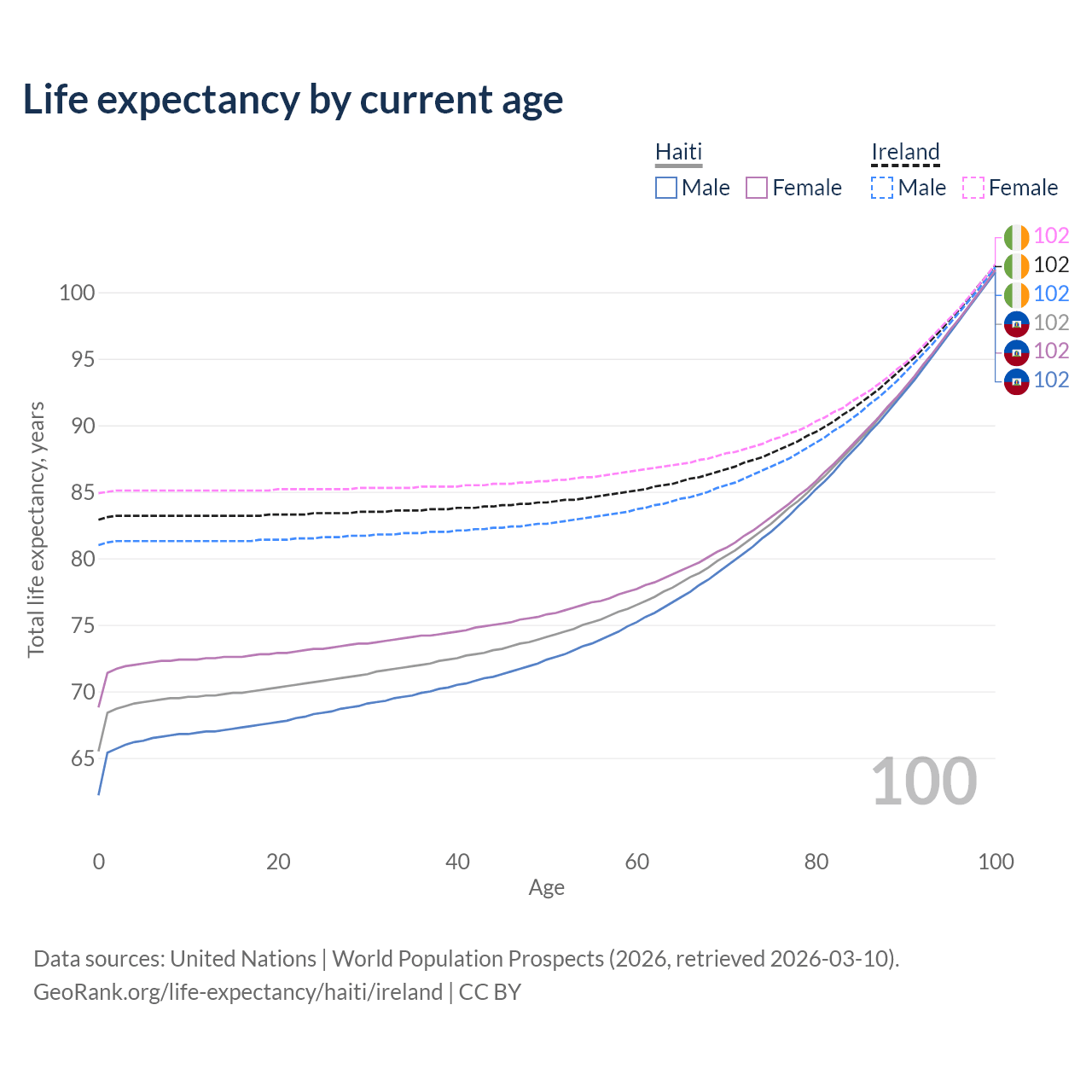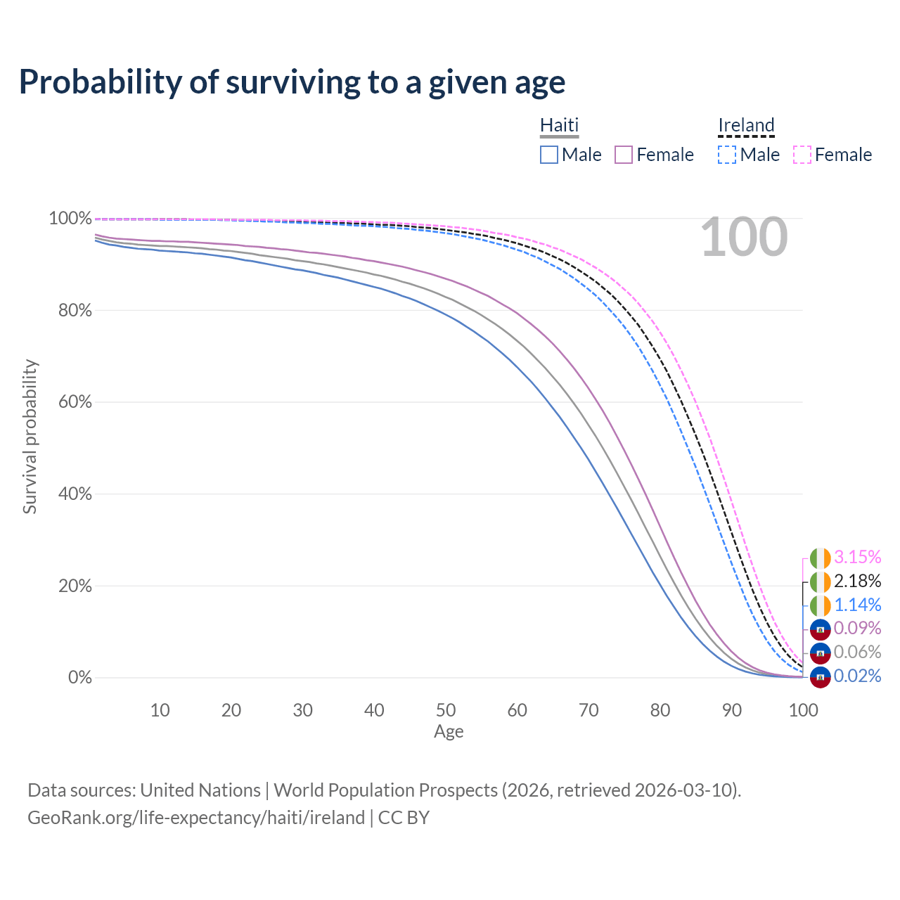 This life expectancy calculator shows the odds of living to 100, 95, 90, and below based on current age for both males and females in Haiti and Ireland, along with mean and median age of death. The calculations are based on the 2026 life tables (actuarial tables) from the UN World Population Prospects.
