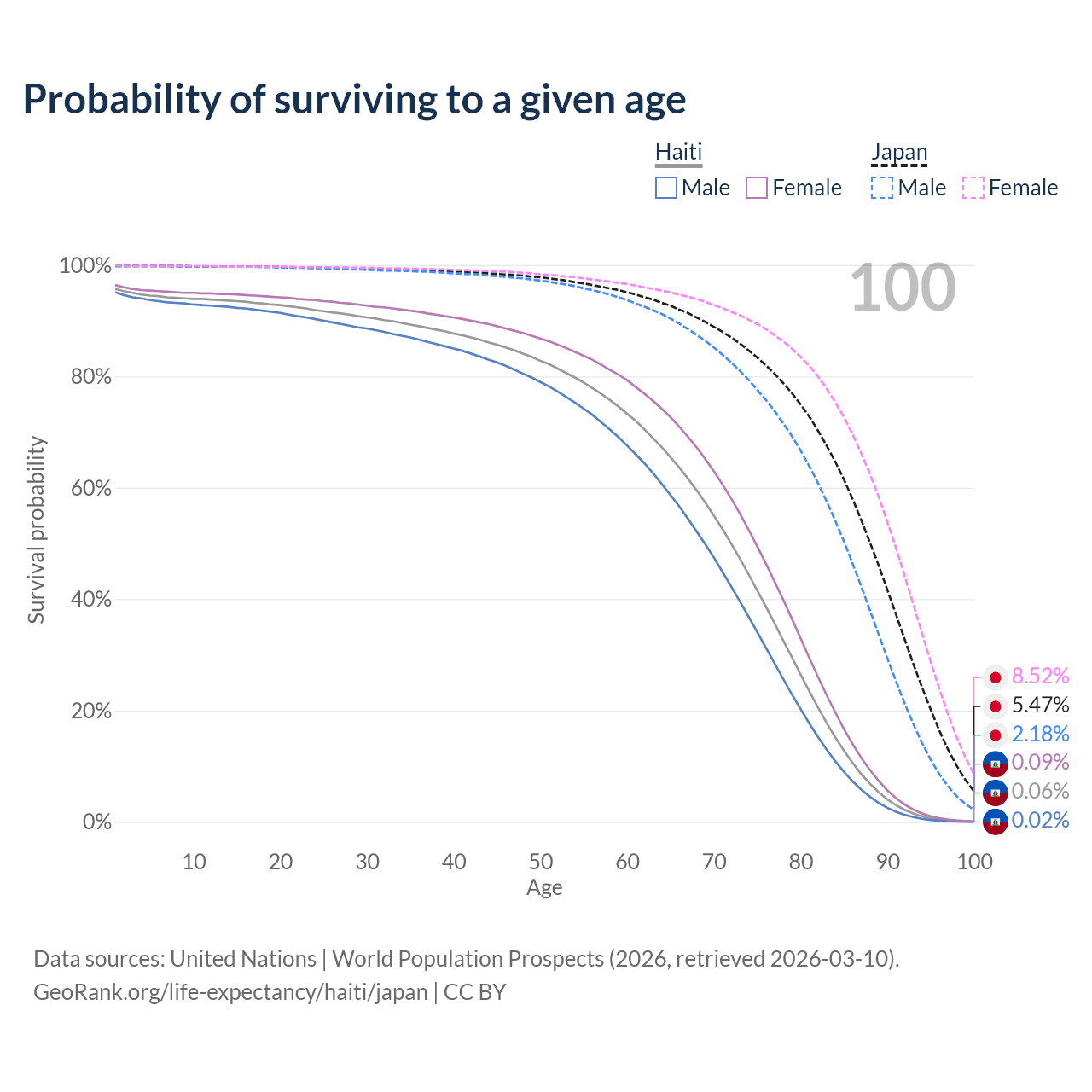 This life expectancy calculator shows the odds of living to 100, 95, 90, and below based on current age for both males and females in Haiti and Japan, along with mean and median age of death. The calculations are based on the 2026 life tables (actuarial tables) from the UN World Population Prospects.