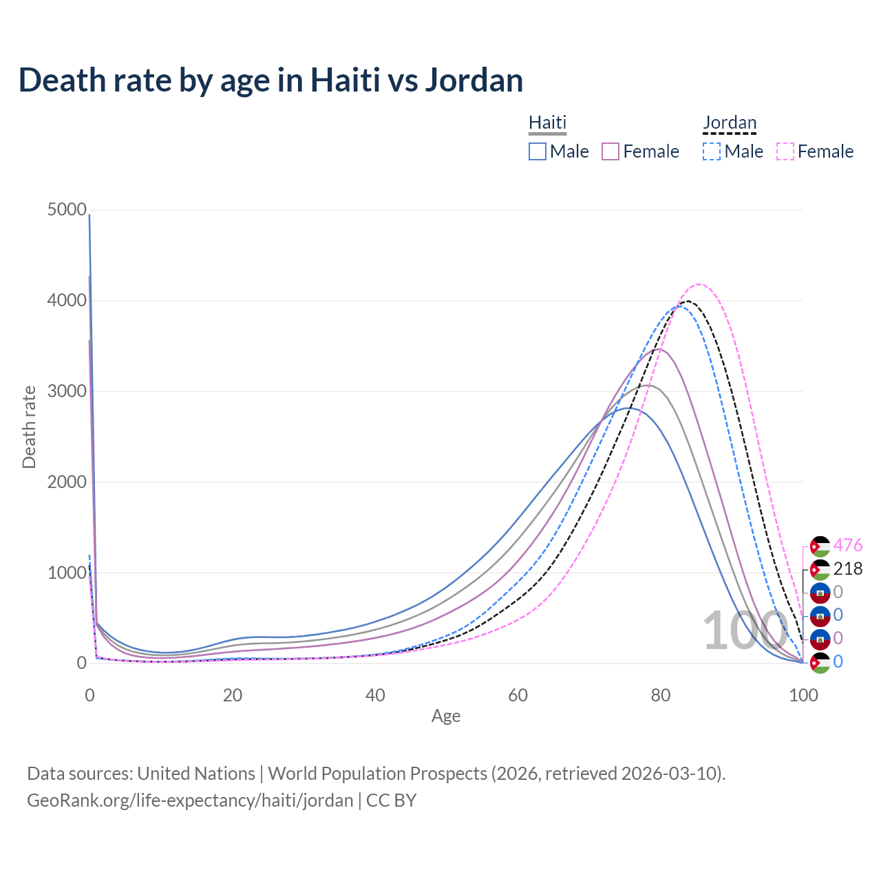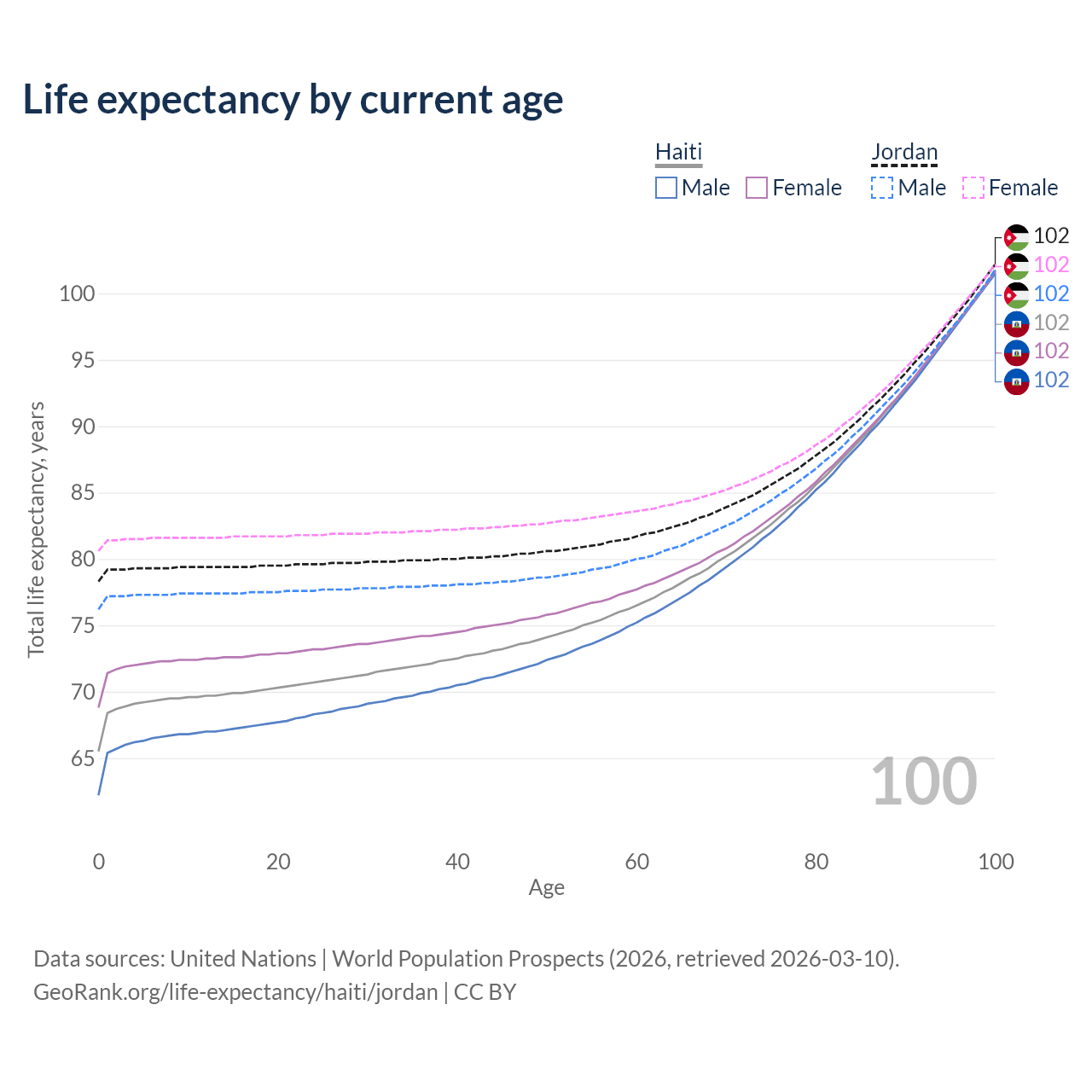 This life expectancy calculator shows the odds of living to 100, 95, 90, and below based on current age for both males and females in Haiti and Jordan, along with mean and median age of death. The calculations are based on the 2026 life tables (actuarial tables) from the UN World Population Prospects.