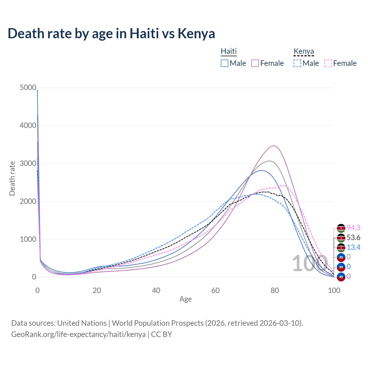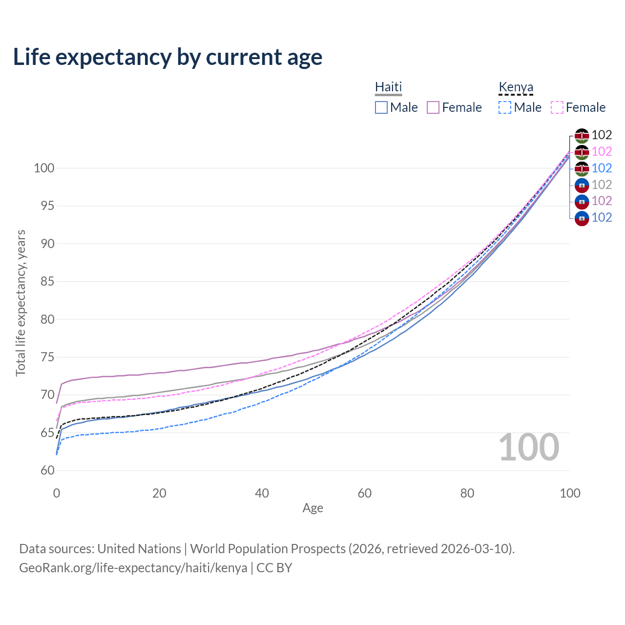 This life expectancy calculator shows the odds of living to 100, 95, 90, and below based on current age for both males and females in Haiti and Kenya, along with mean and median age of death. The calculations are based on the 2026 life tables (actuarial tables) from the UN World Population Prospects.