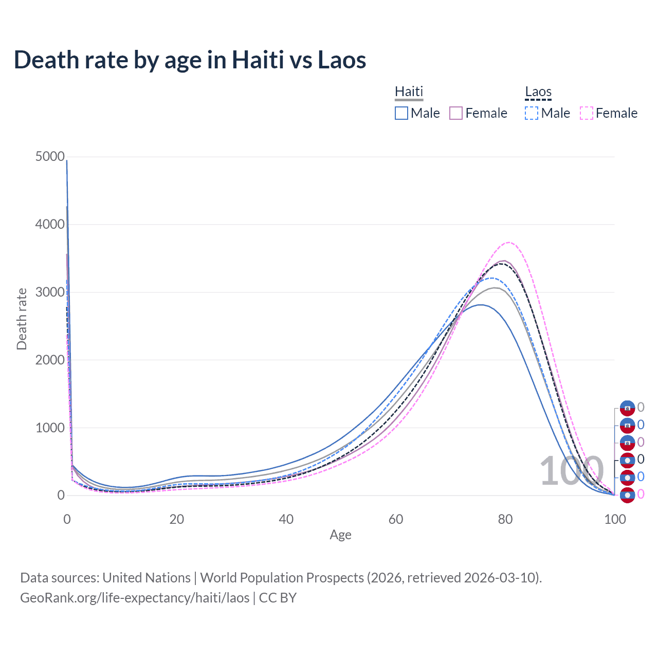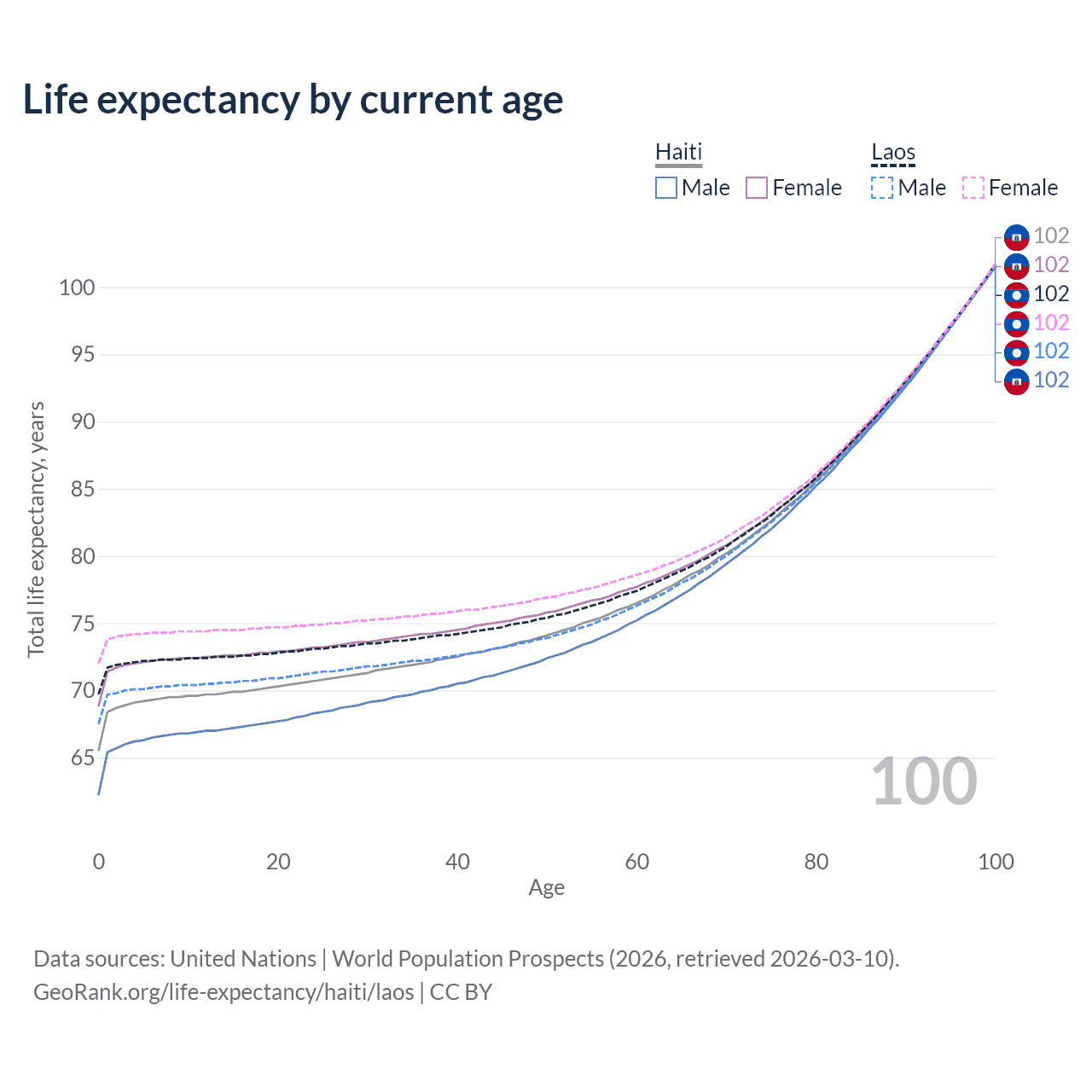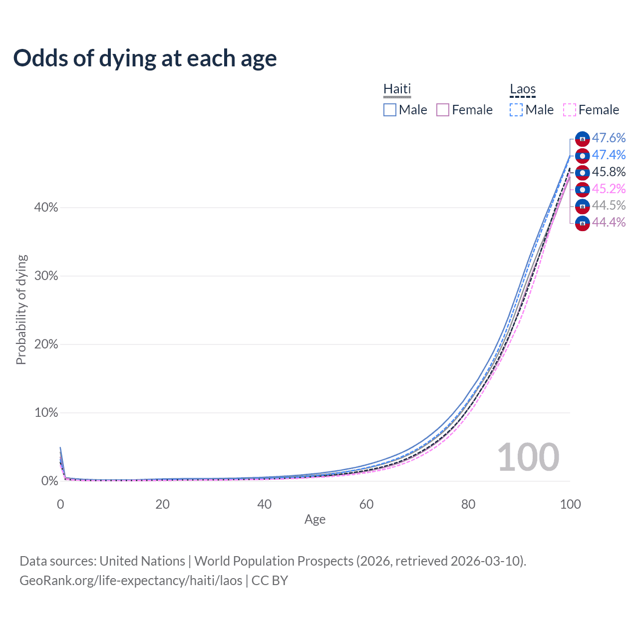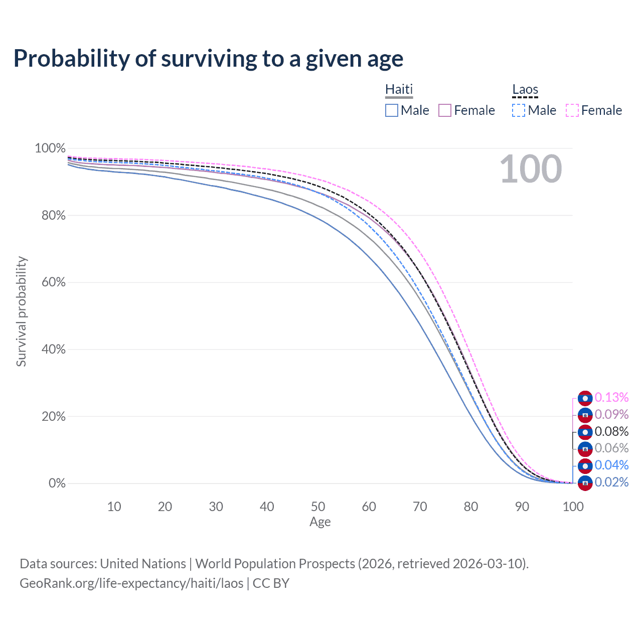 This life expectancy calculator shows the odds of living to 100, 95, 90, and below based on current age for both males and females in Haiti and Laos, along with mean and median age of death. The calculations are based on the 2026 life tables (actuarial tables) from the UN World Population Prospects.
