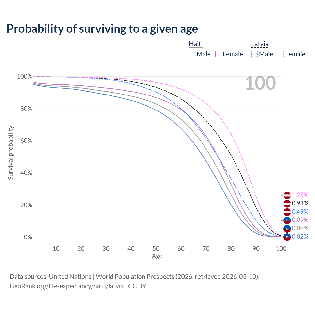 This life expectancy calculator shows the odds of living to 100, 95, 90, and below based on current age for both males and females in Haiti and Latvia, along with mean and median age of death. The calculations are based on the 2026 life tables (actuarial tables) from the UN World Population Prospects.