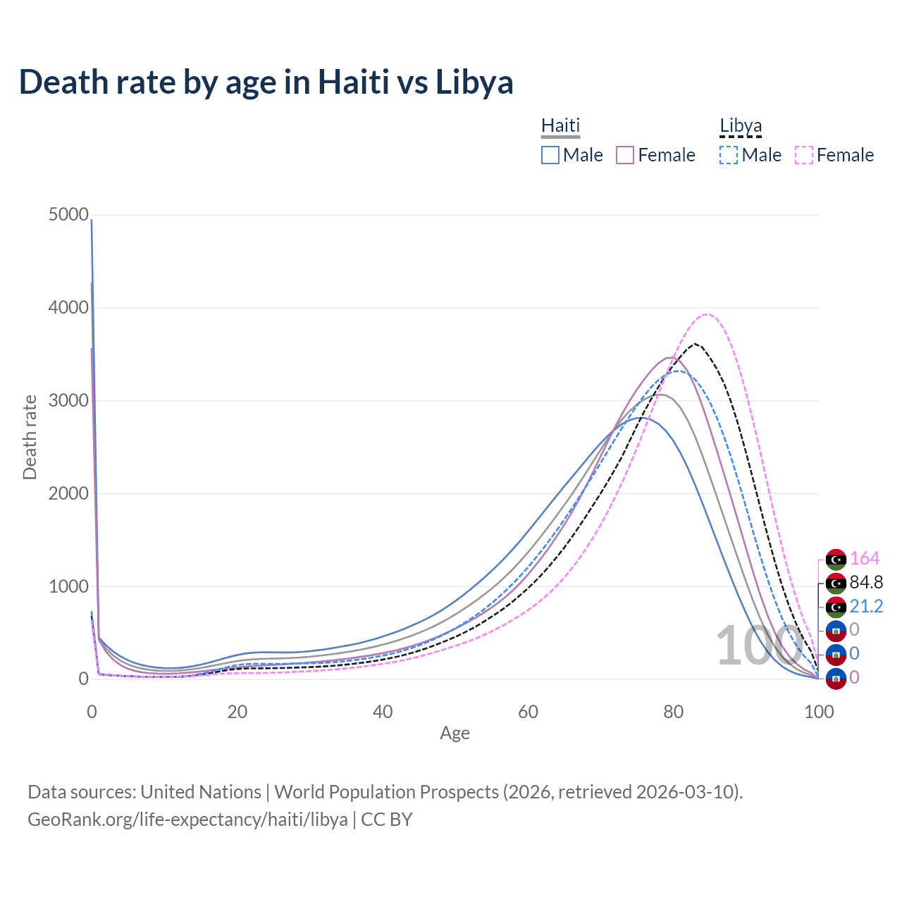 In Haiti, the most common age of death is 0, compared to 83 in Libya. The median age of death is 72 in Haiti and 78.8 in Libya, meaning only half of each cohort is expected to live past that age.