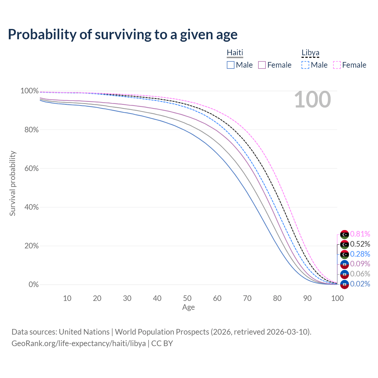 This life expectancy calculator shows the odds of living to 100, 95, 90, and below based on current age for both males and females in Haiti and Libya, along with mean and median age of death. The calculations are based on the 2026 life tables (actuarial tables) from the UN World Population Prospects.