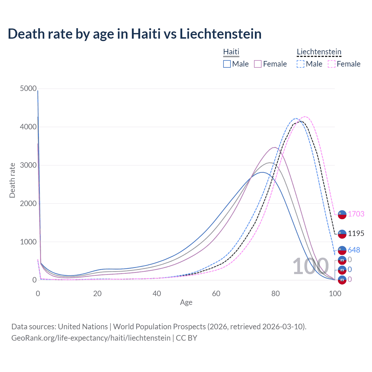 In Haiti, the most common age of death is 0, compared to 89 in Liechtenstein. The median age of death is 72 in Haiti and 86.3 in Liechtenstein, meaning only half of each cohort is expected to live past that age.