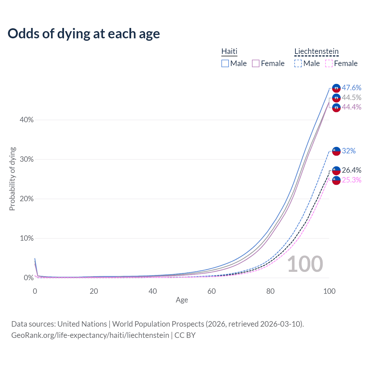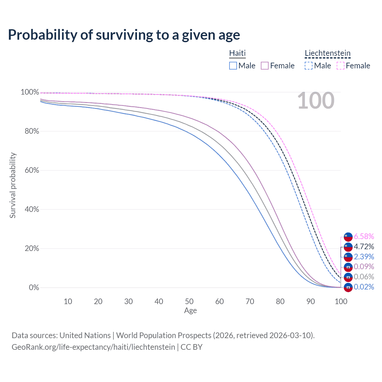 This life expectancy calculator shows the odds of living to 100, 95, 90, and below based on current age for both males and females in Haiti and Liechtenstein, along with mean and median age of death. The calculations are based on the 2026 life tables (actuarial tables) from the UN World Population Prospects.