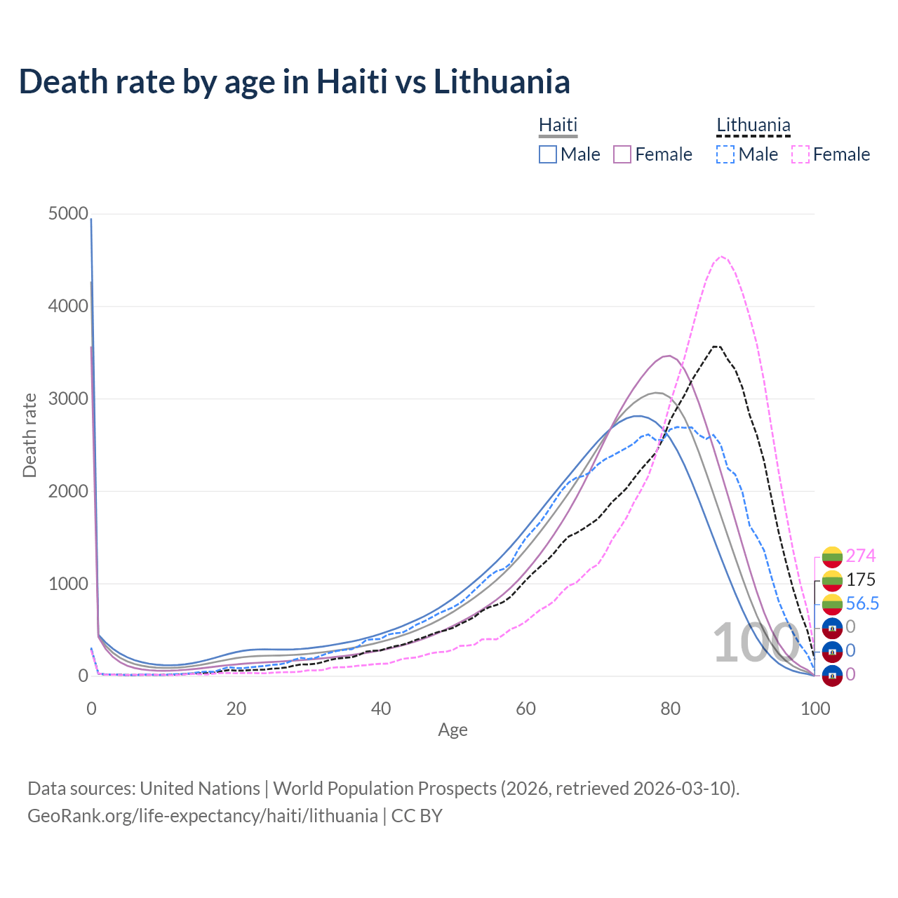 In Haiti, the most common age of death is 0, compared to 86 in Lithuania. The median age of death is 72 in Haiti and 80.4 in Lithuania, meaning only half of each cohort is expected to live past that age.