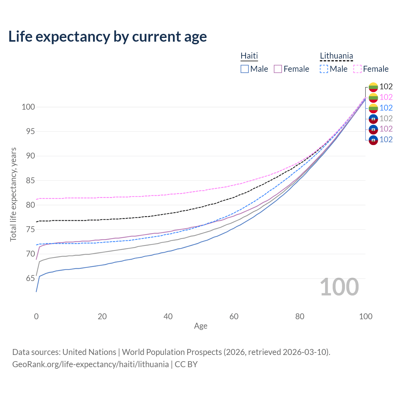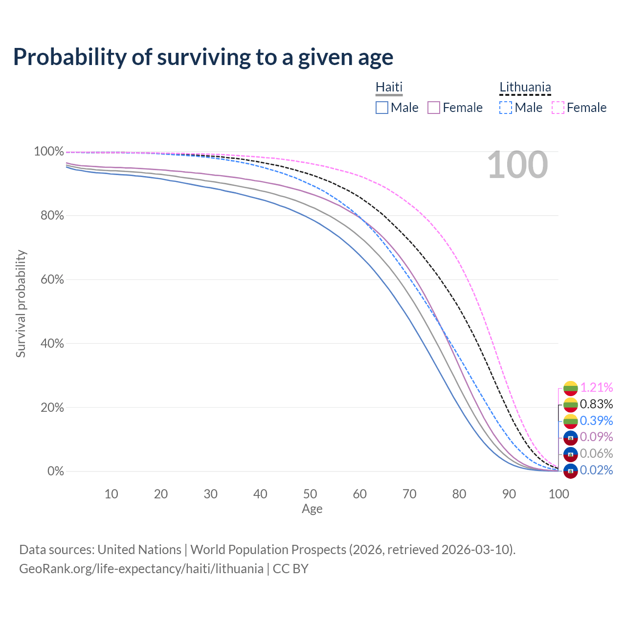 This life expectancy calculator shows the odds of living to 100, 95, 90, and below based on current age for both males and females in Haiti and Lithuania, along with mean and median age of death. The calculations are based on the 2026 life tables (actuarial tables) from the UN World Population Prospects.