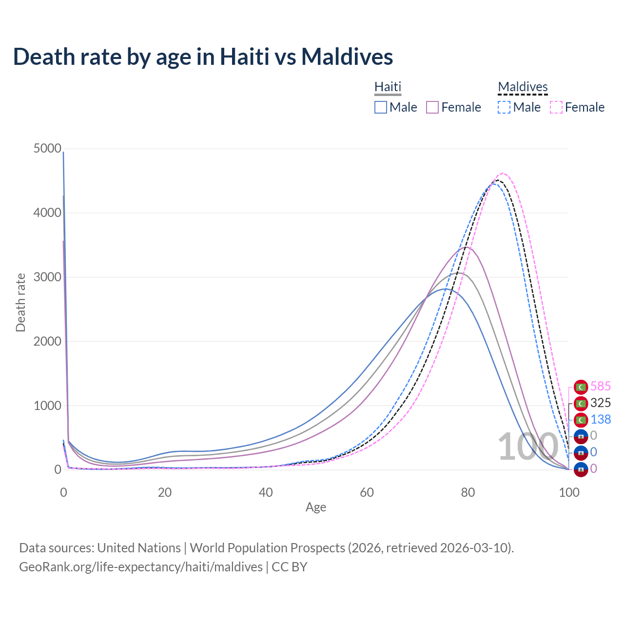 In Haiti, the most common age of death is 0, compared to 86 in Maldives. The median age of death is 72 in Haiti and 83.8 in Maldives, meaning only half of each cohort is expected to live past that age.