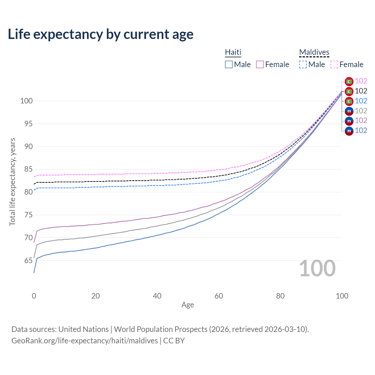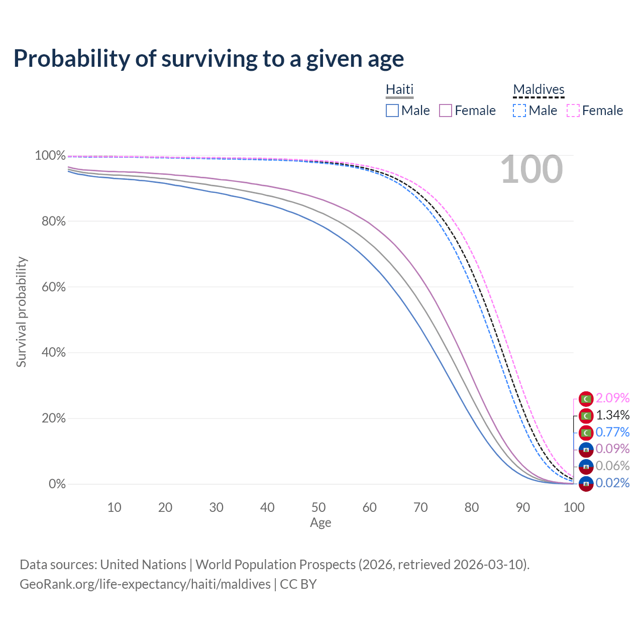 This life expectancy calculator shows the odds of living to 100, 95, 90, and below based on current age for both males and females in Haiti and Maldives, along with mean and median age of death. The calculations are based on the 2026 life tables (actuarial tables) from the UN World Population Prospects.