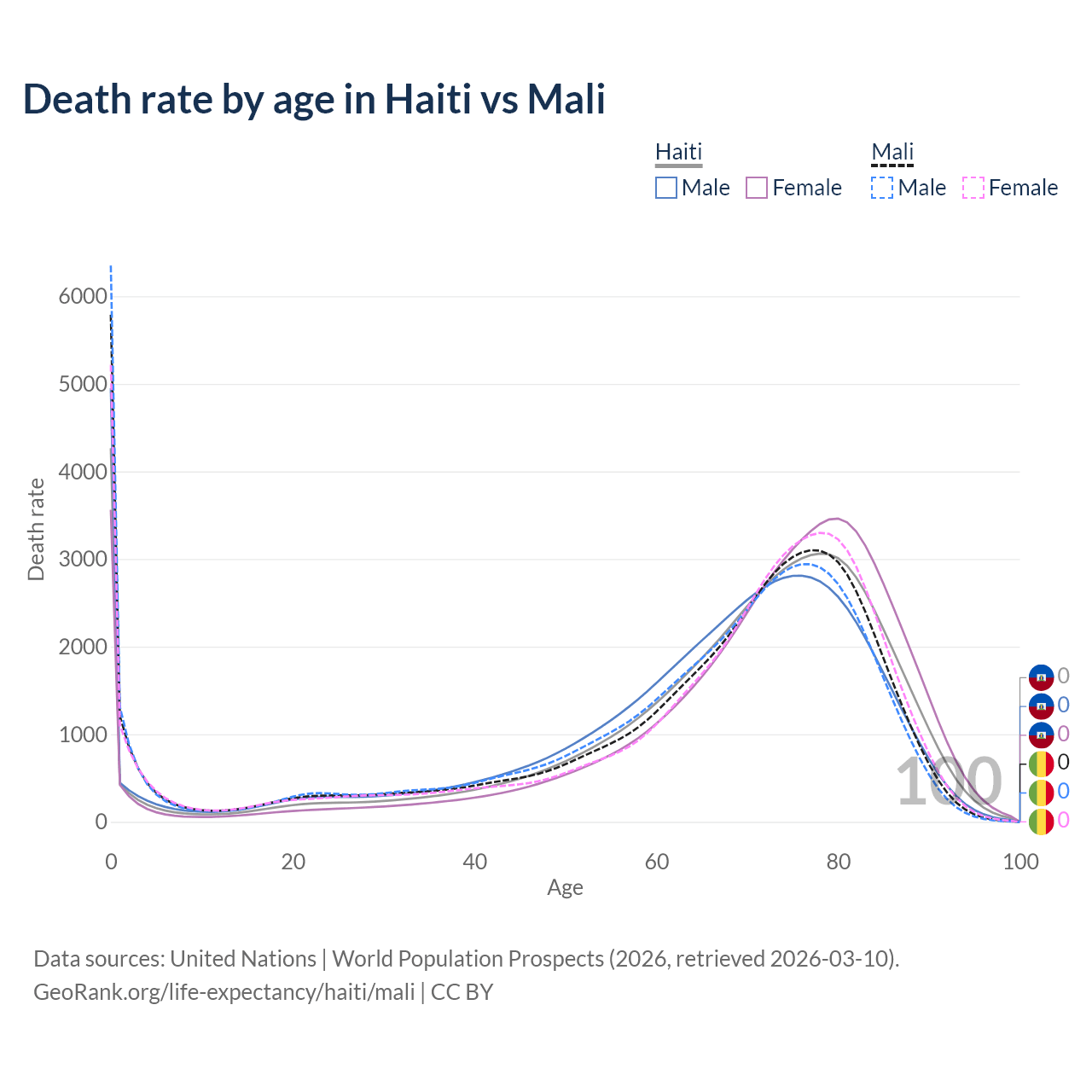 In Haiti, the most common age of death is 0, compared to 0 in Mali. The median age of death is 72 in Haiti and 70.2 in Mali, meaning only half of each cohort is expected to live past that age.