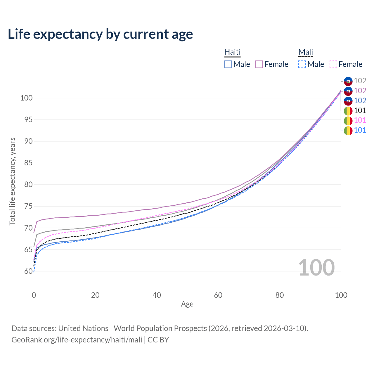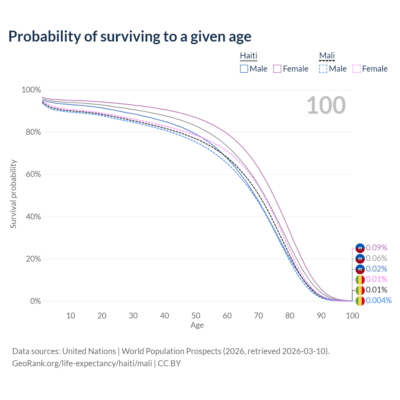This life expectancy calculator shows the odds of living to 100, 95, 90, and below based on current age for both males and females in Haiti and Mali, along with mean and median age of death. The calculations are based on the 2026 life tables (actuarial tables) from the UN World Population Prospects.