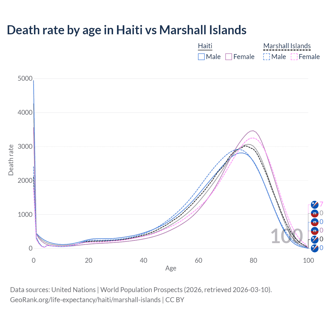 In Haiti, the most common age of death is 0, compared to 77 in the Marshall Islands. The median age of death is 72 in Haiti and 72 in the Marshall Islands, meaning only half of each cohort is expected to live past that age.