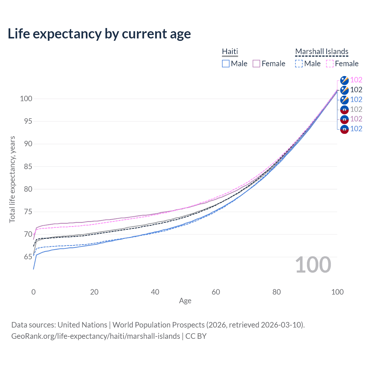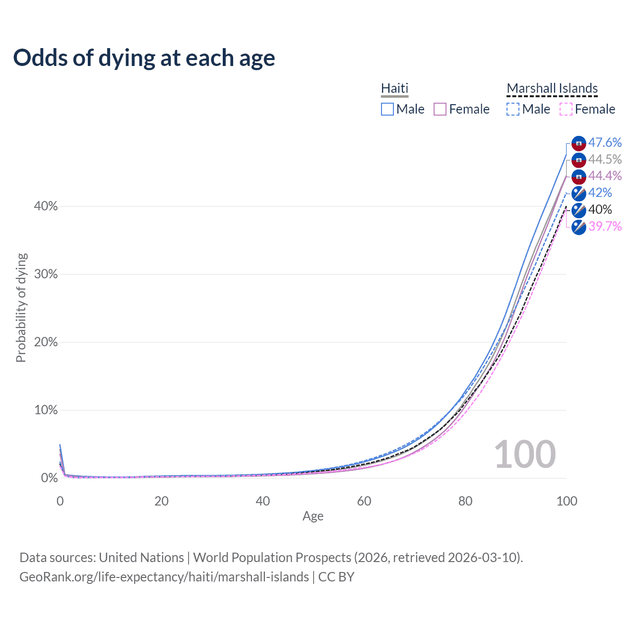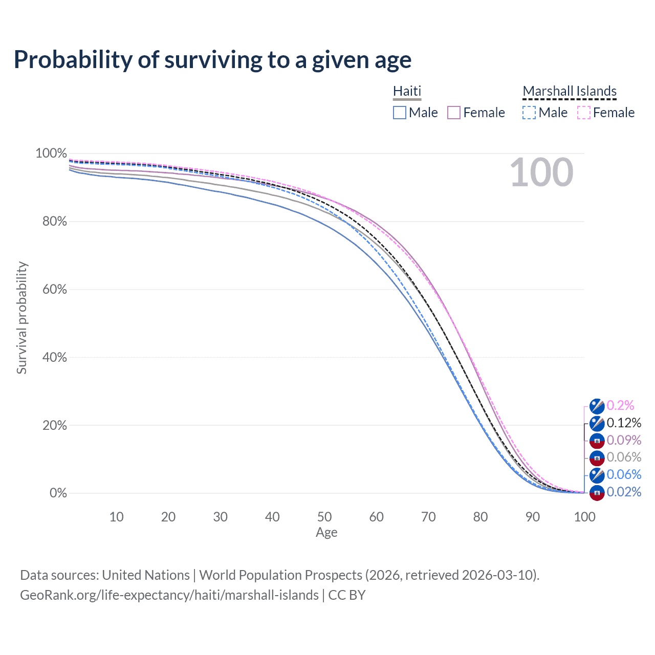 This life expectancy calculator shows the odds of living to 100, 95, 90, and below based on current age for both males and females in Haiti and the Marshall Islands, along with mean and median age of death. The calculations are based on the 2026 life tables (actuarial tables) from the UN World Population Prospects.