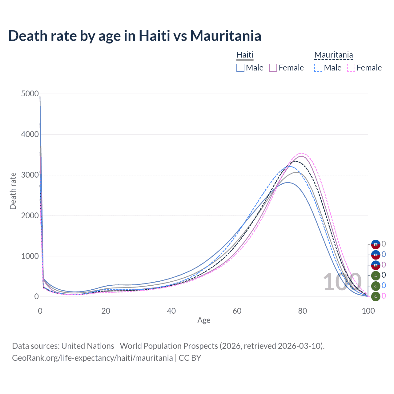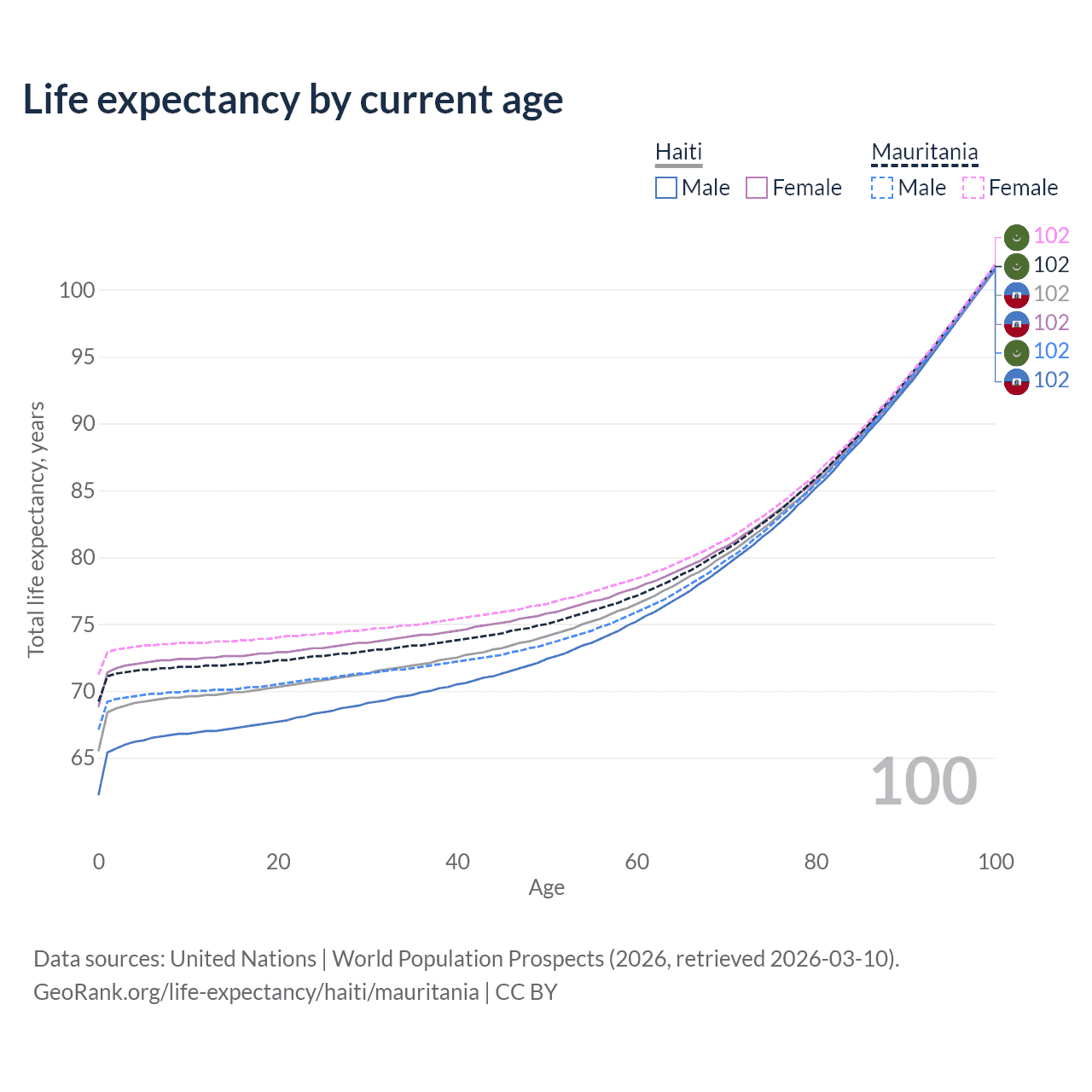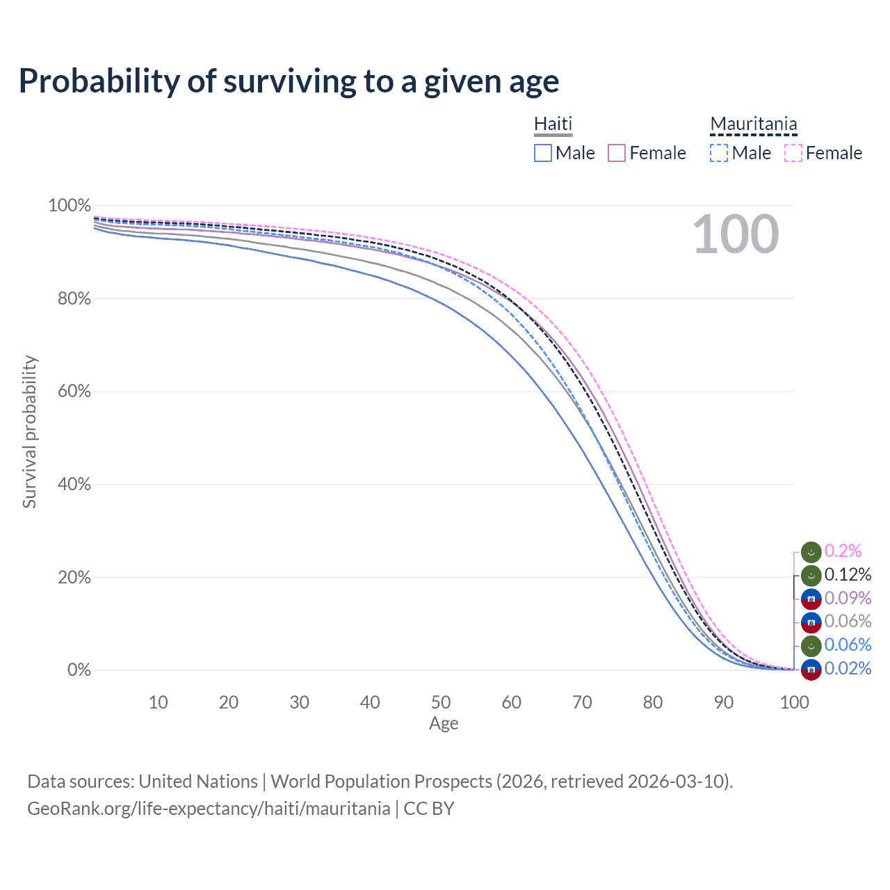 This life expectancy calculator shows the odds of living to 100, 95, 90, and below based on current age for both males and females in Haiti and Mauritania, along with mean and median age of death. The calculations are based on the 2026 life tables (actuarial tables) from the UN World Population Prospects.