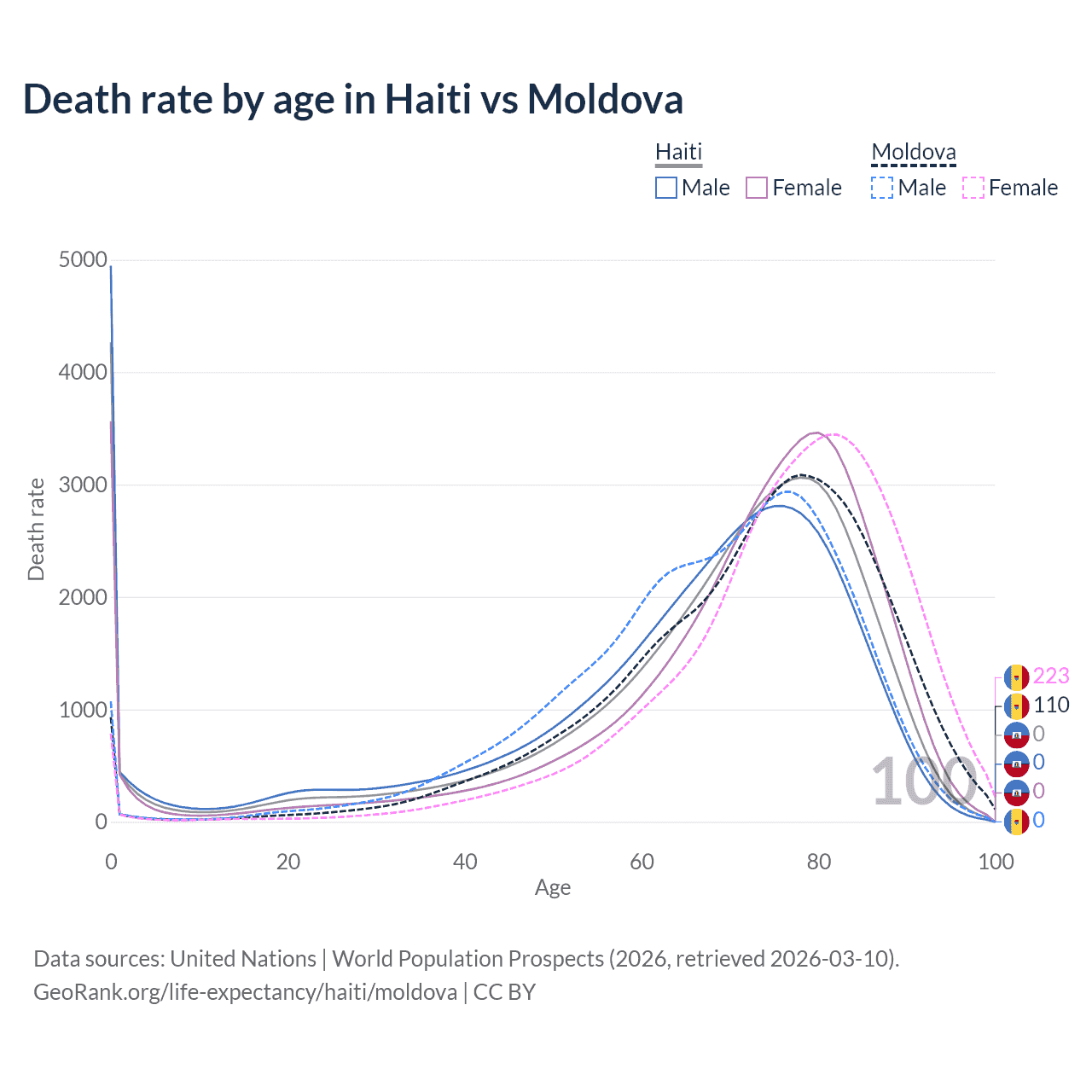 In Haiti, the most common age of death is 0, compared to 78 in Moldova. The median age of death is 72 in Haiti and 74.8 in Moldova, meaning only half of each cohort is expected to live past that age.