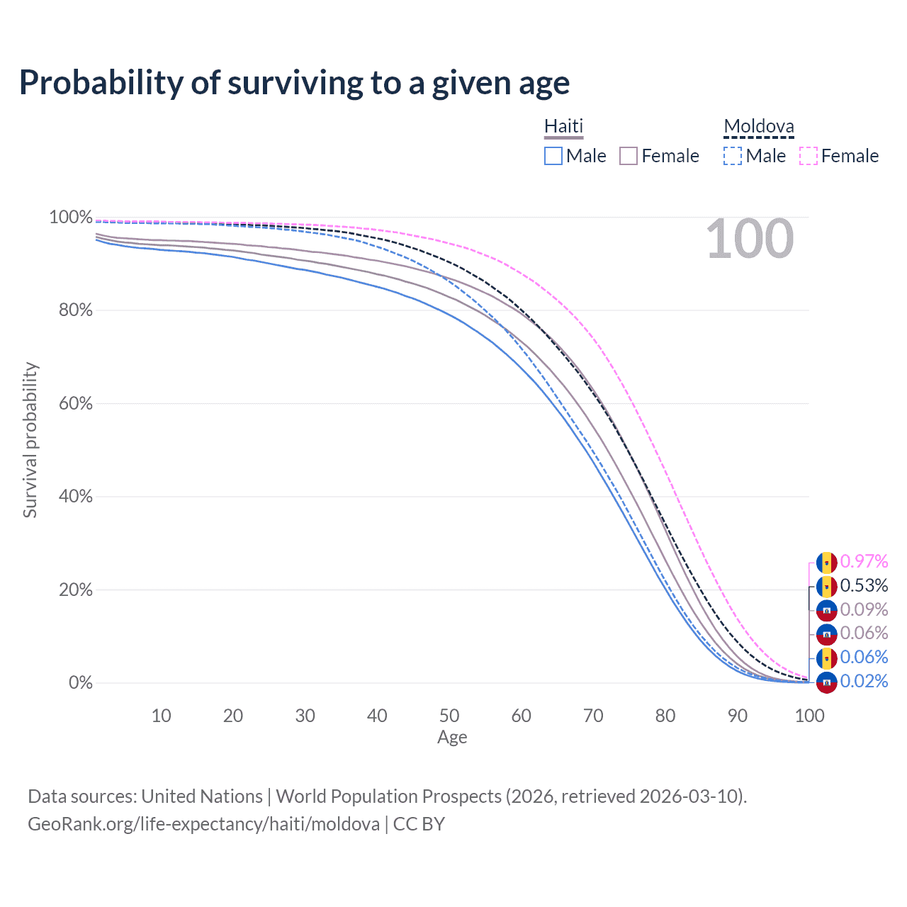 This life expectancy calculator shows the odds of living to 100, 95, 90, and below based on current age for both males and females in Haiti and Moldova, along with mean and median age of death. The calculations are based on the 2026 life tables (actuarial tables) from the UN World Population Prospects.