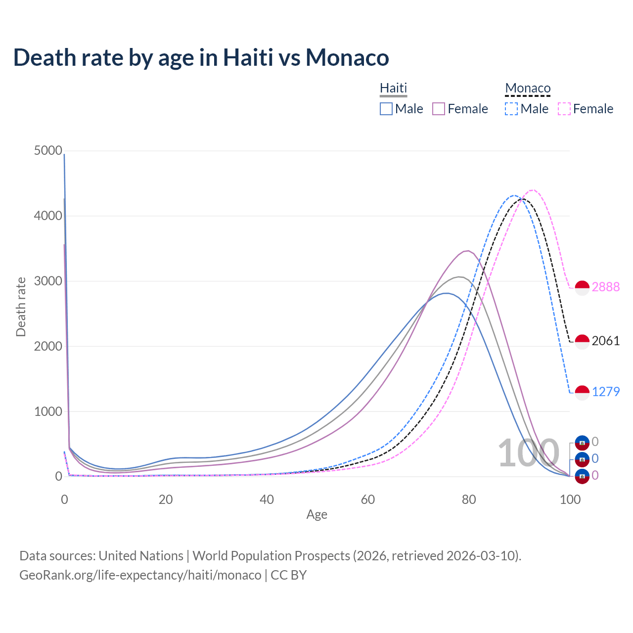 In Haiti, the most common age of death is 0, compared to 91 in Monaco. The median age of death is 72 in Haiti and 88.7 in Monaco, meaning only half of each cohort is expected to live past that age.