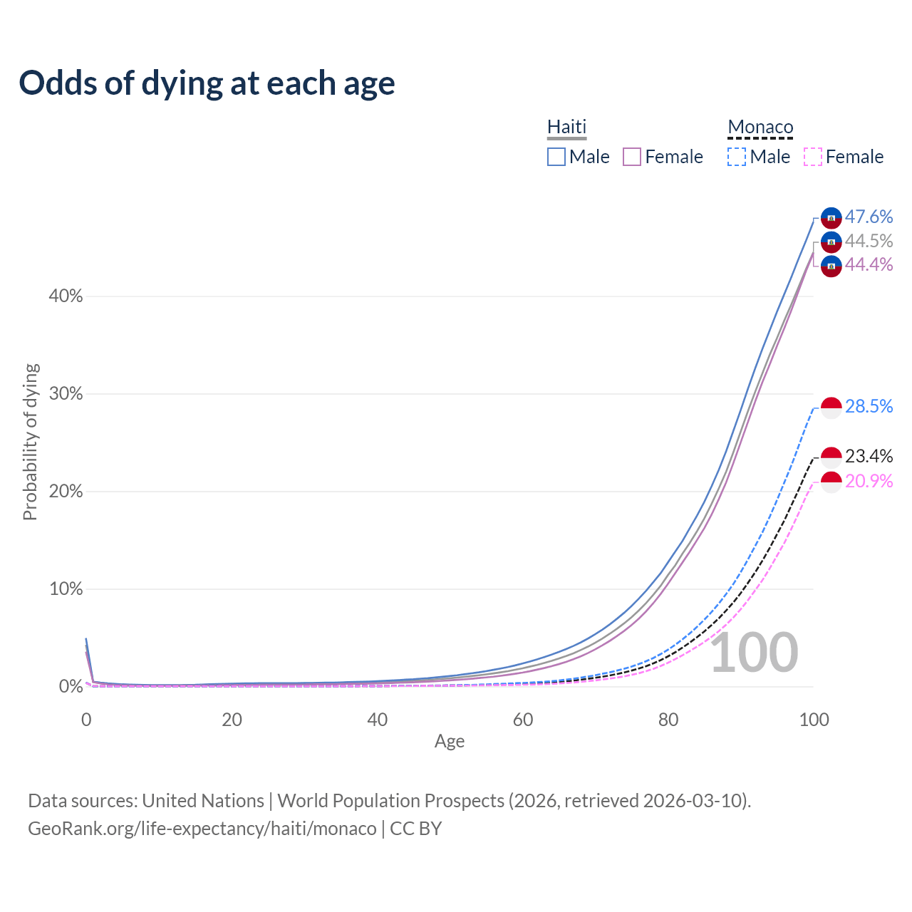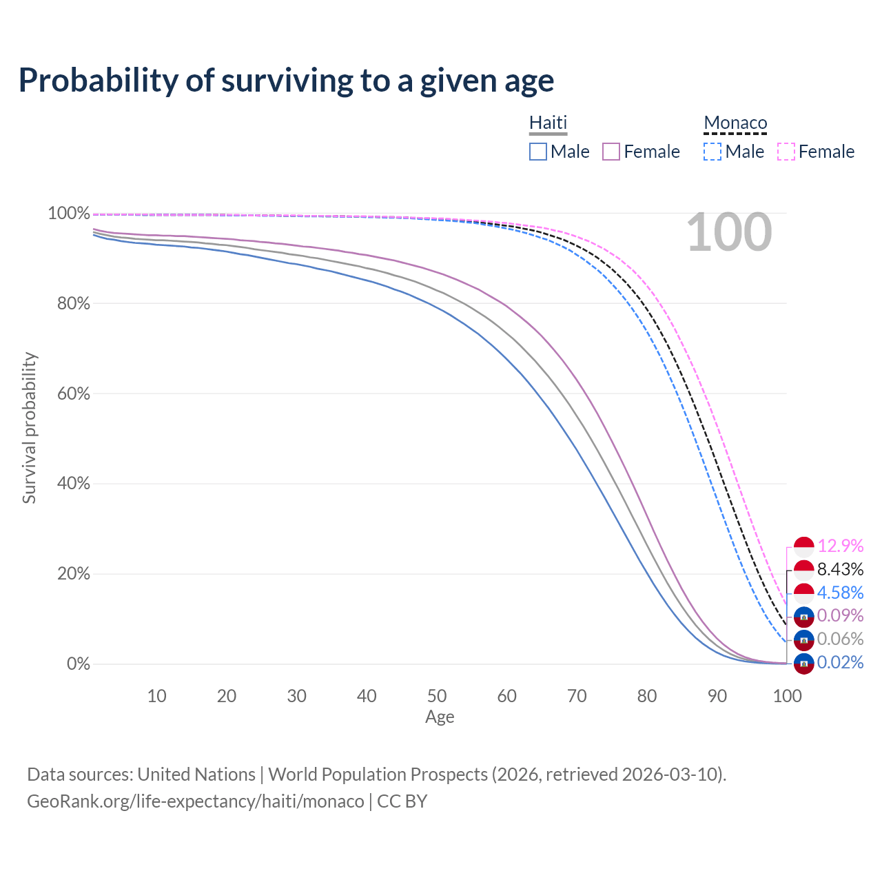 This life expectancy calculator shows the odds of living to 100, 95, 90, and below based on current age for both males and females in Haiti and Monaco, along with mean and median age of death. The calculations are based on the 2026 life tables (actuarial tables) from the UN World Population Prospects.